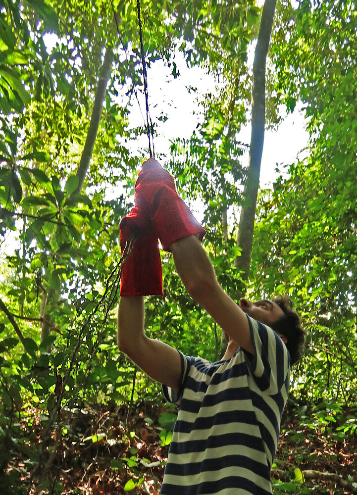 Marc Jeanson using protecting gloves to pull down the dreadful barbed roots of Cercestis blancii, Ebodje, Campo, Cameroon, March 2018
