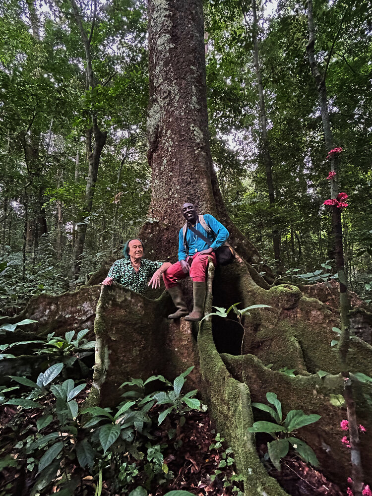 Patrick Blanc and Eric Ngansop among tree buttresses, in the habitat of Cercestis blancii, Ebodje, Campo, Cameroon, Sept. 2023