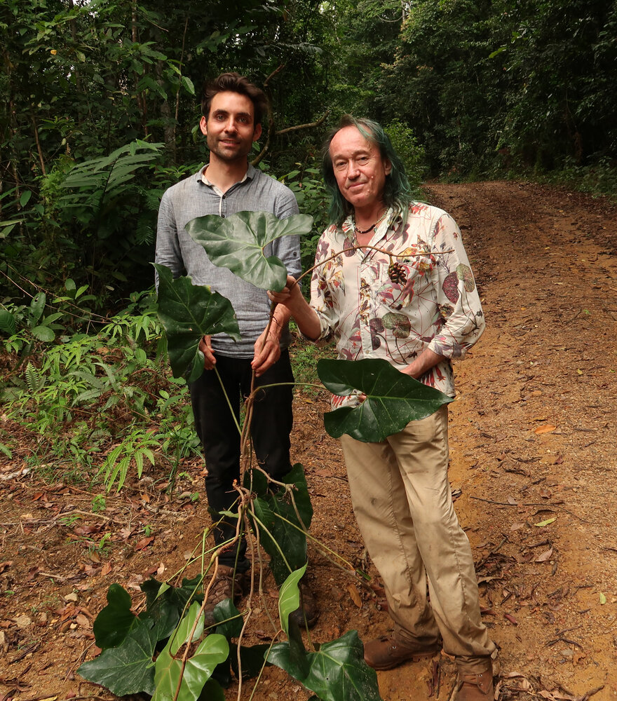 Patrick Blanc and Marc Jeanson holding a fruiting specimen of Cercestis blancii, Ebodjé, Campo, Cameroon, March 2018