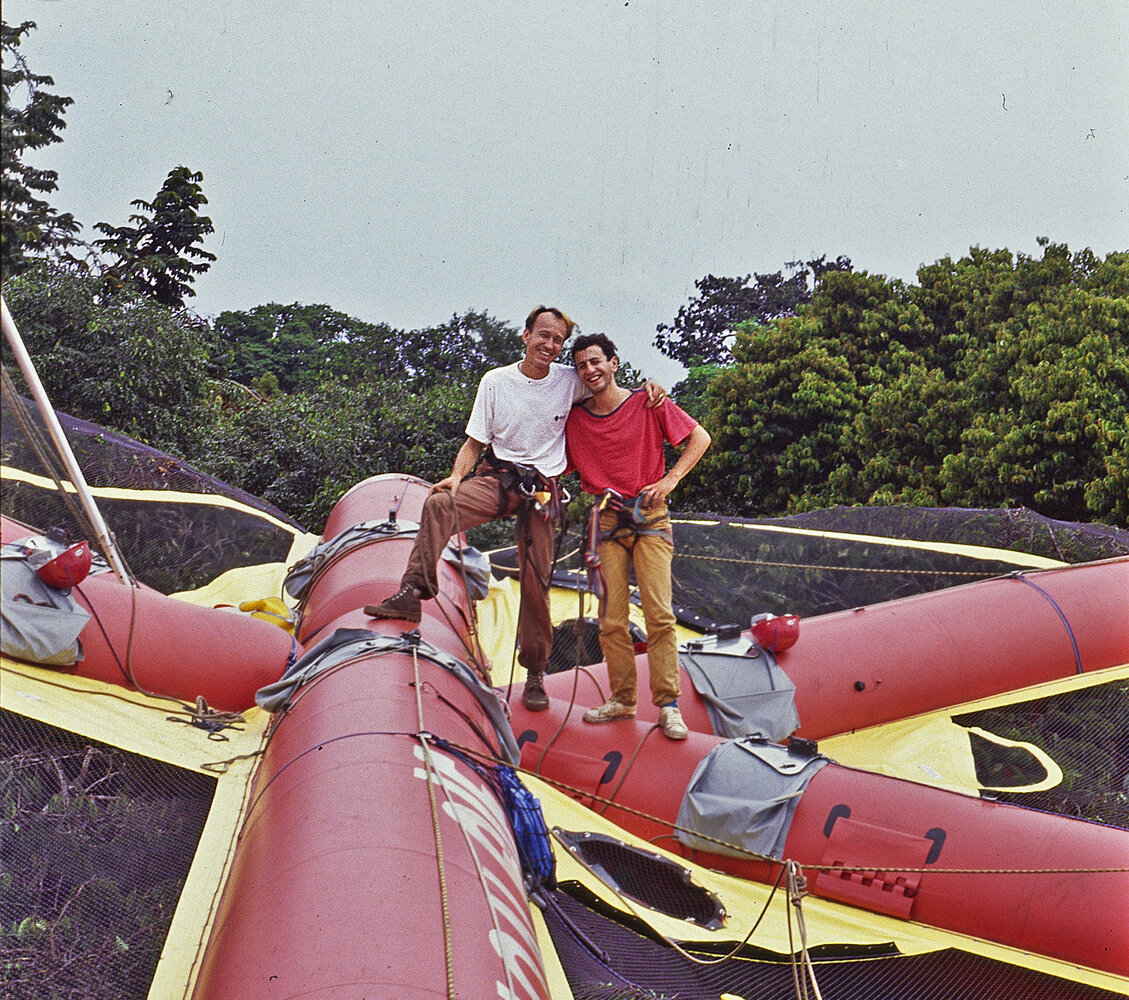 Patrick Blanc and Pascal Heni on the Canopy Raft, 40 m above forest floor, both happy just after Patrick discovered Cercestis blancii while climbing to the top, Ebodje, Campo, Cameroon, 1991, photo by Gilles Ebersolt