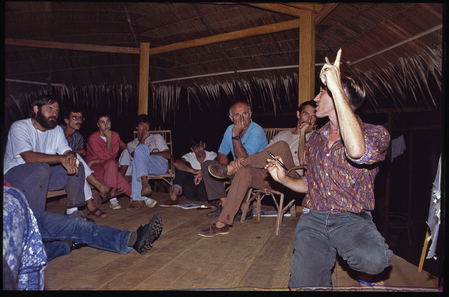 Patrick Blanc lecturing at the Canopy Raft field station, Ebodje where he discovered Cercestis blancii, Cameroon, Nov.1991