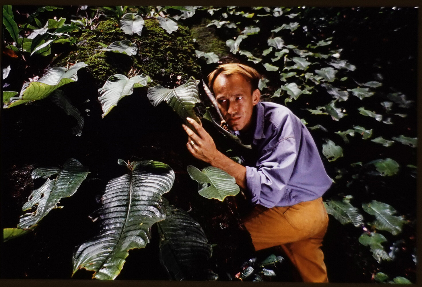Patrick Blanc observing the monophyllous Streptocarpus (syn. Acanthonema) strigosum, Campo, Cameroon, Oct. 1991, photo Raphael Gaillarde