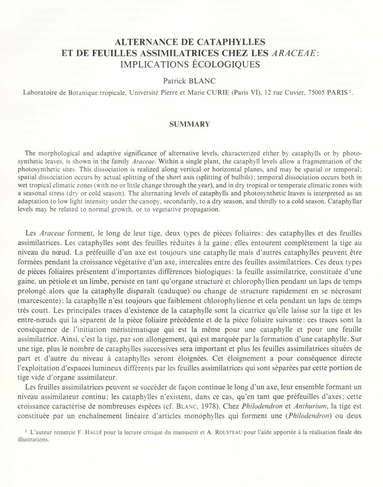 Blanc P. - 1982, Alternance de cataphylles et de feuilles assimilatrices chez les Araceae, implications écologiques, Mem. Mus. nat. Hist. nat., 132, 263-272
