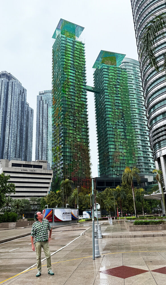 Patrick Blanc in front of Le Nouvel towers with the climbing plants that he installed ten years before, Kuala Lumpur, Sept. 2025