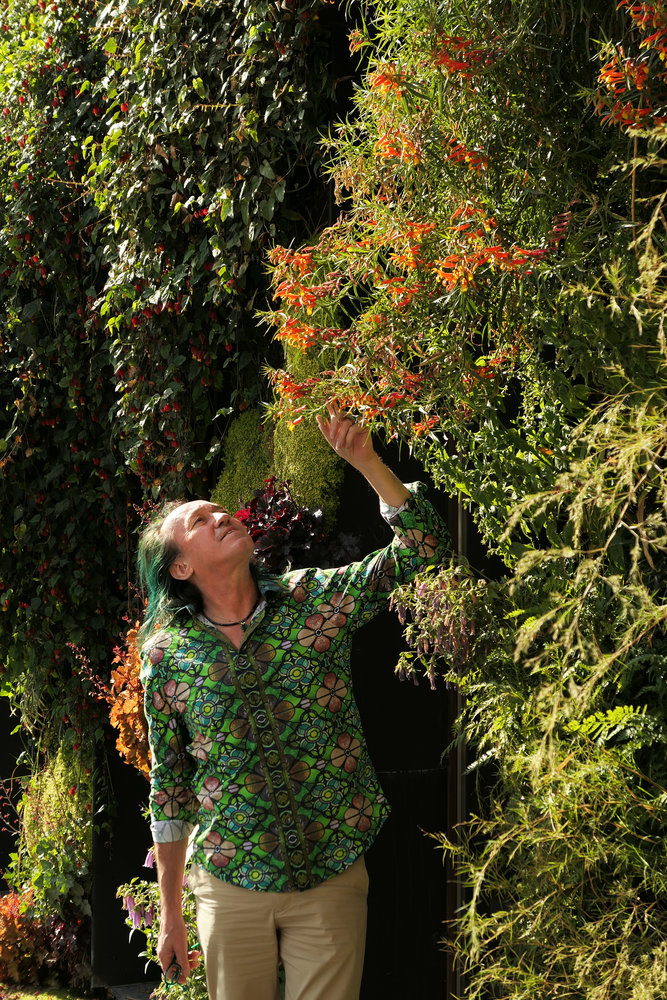 Patrick Blanc observing the flowers of Lobelia laxiflora on his Vertical Garden, Mc Arthur Glen Provence, Mas de la Peronne, Miramas, April 2017