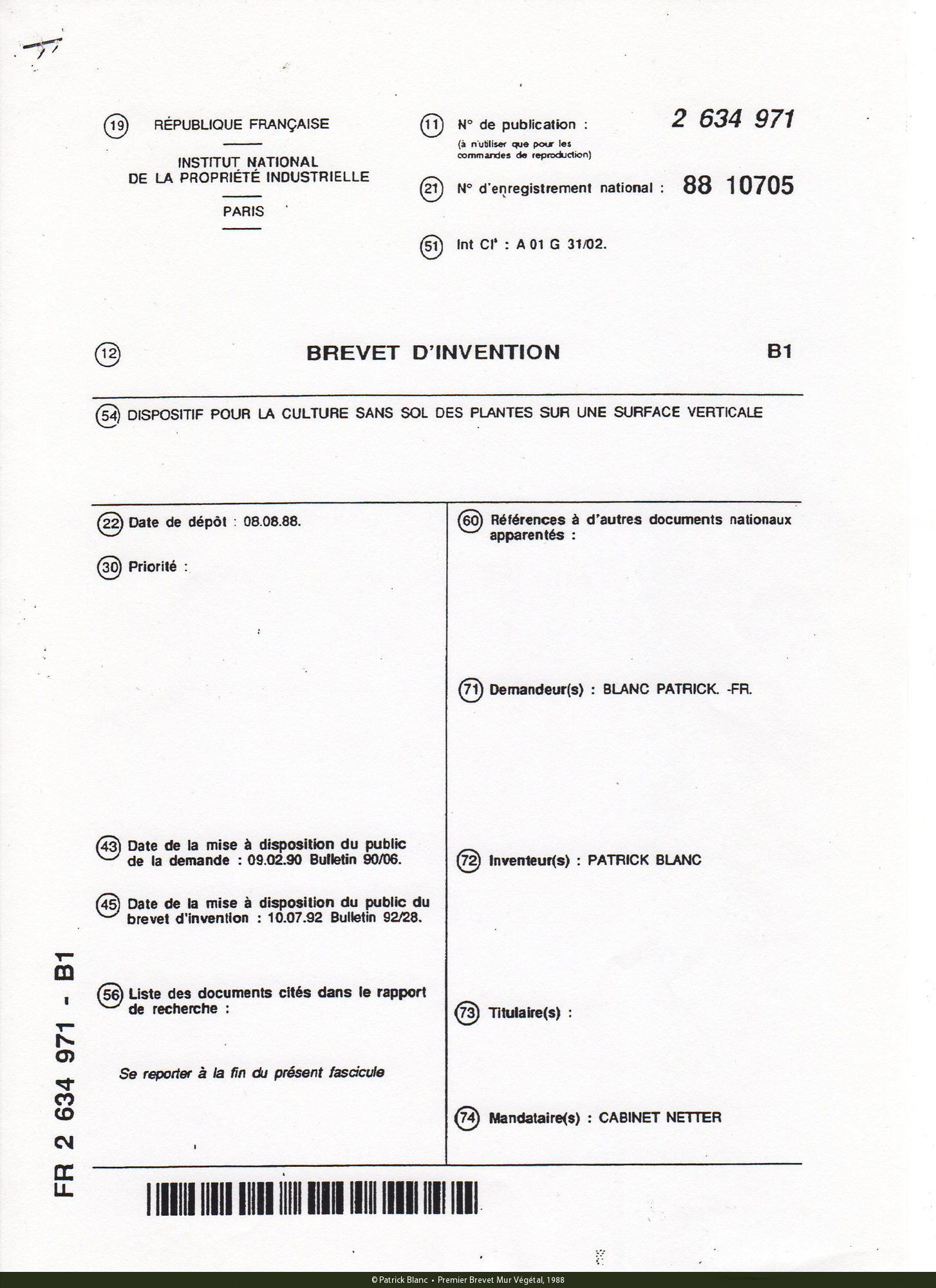 First Patent Mur Végétal, 1988