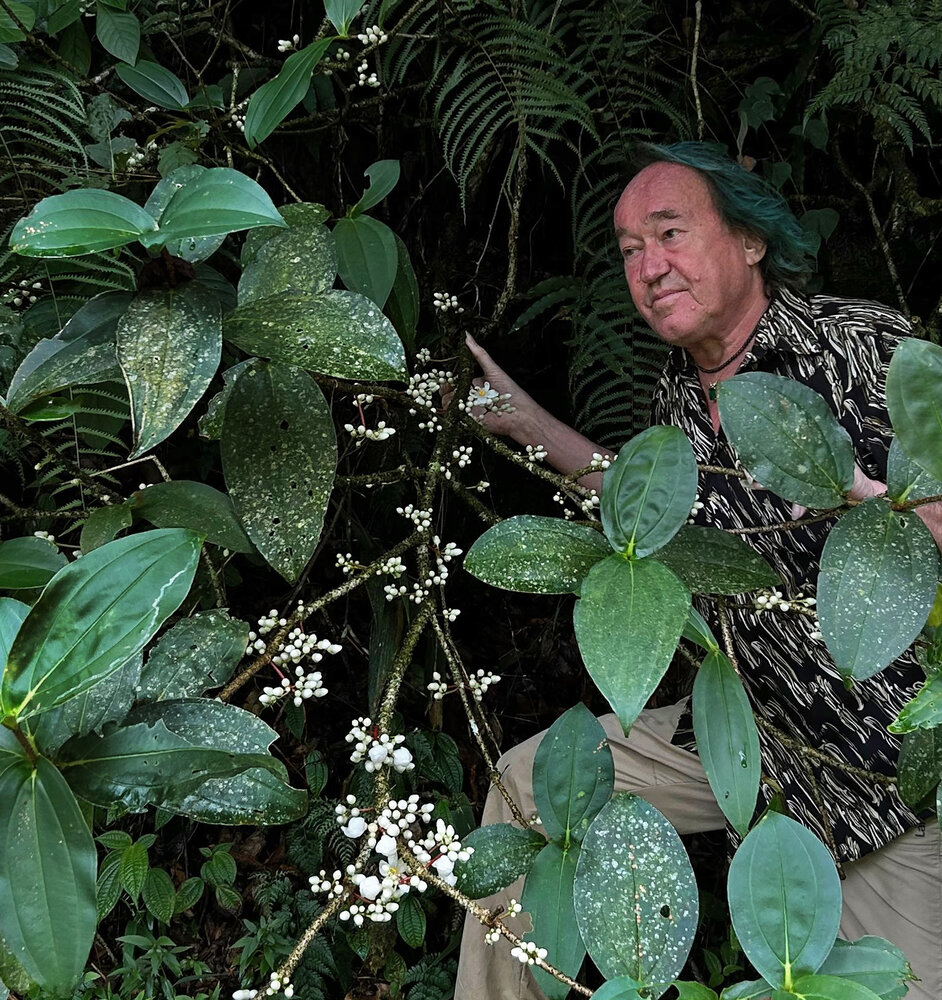 Patrick Blanc observing the large white flowers of the cauliflorous Medinilla venusta, Cameron Highlands, Malaysia, Sept. 2025