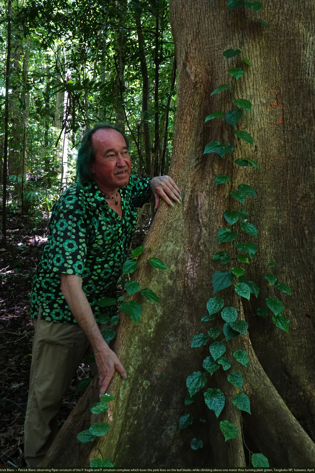 Patrick Blanc observing Piper ornatum of the P. fragile and P. ornatum complexe which loses the pink lines on the leaf blades while climbing above one meter thus turning plain green, Tangkoko NP, Sulawesi, April 2024