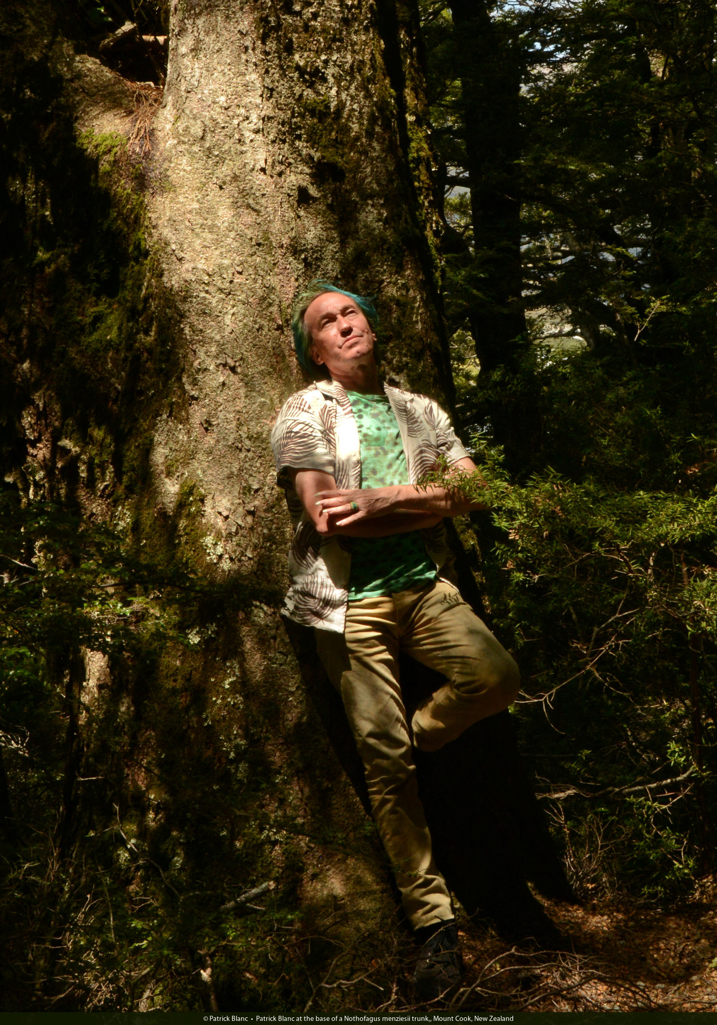 Patrick Blanc at the base of a Nothofagus menziesii trunk,, Mount Cook, New Zealand