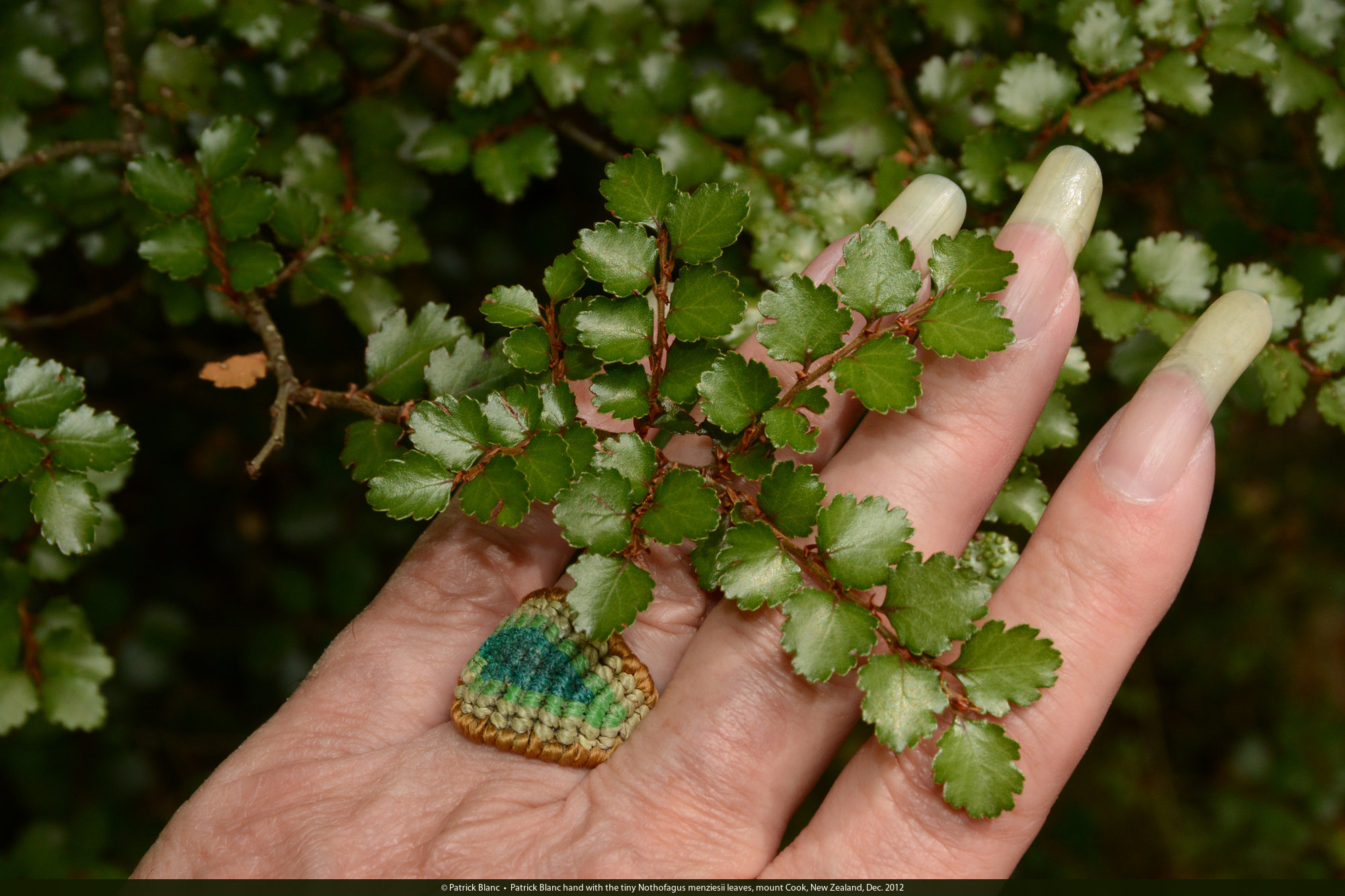 Patrick Blanc hand with the tiny Nothofagus menziesii leaves, mount Cook, New Zealand, Dec. 2012