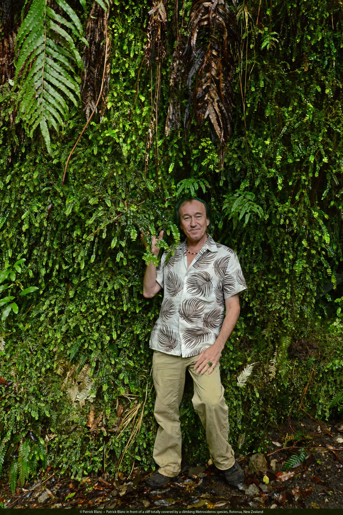 Patrick Blanc in front of a cliff totally covered by a climbing Metrosideros species, Rotorua, New Zealand