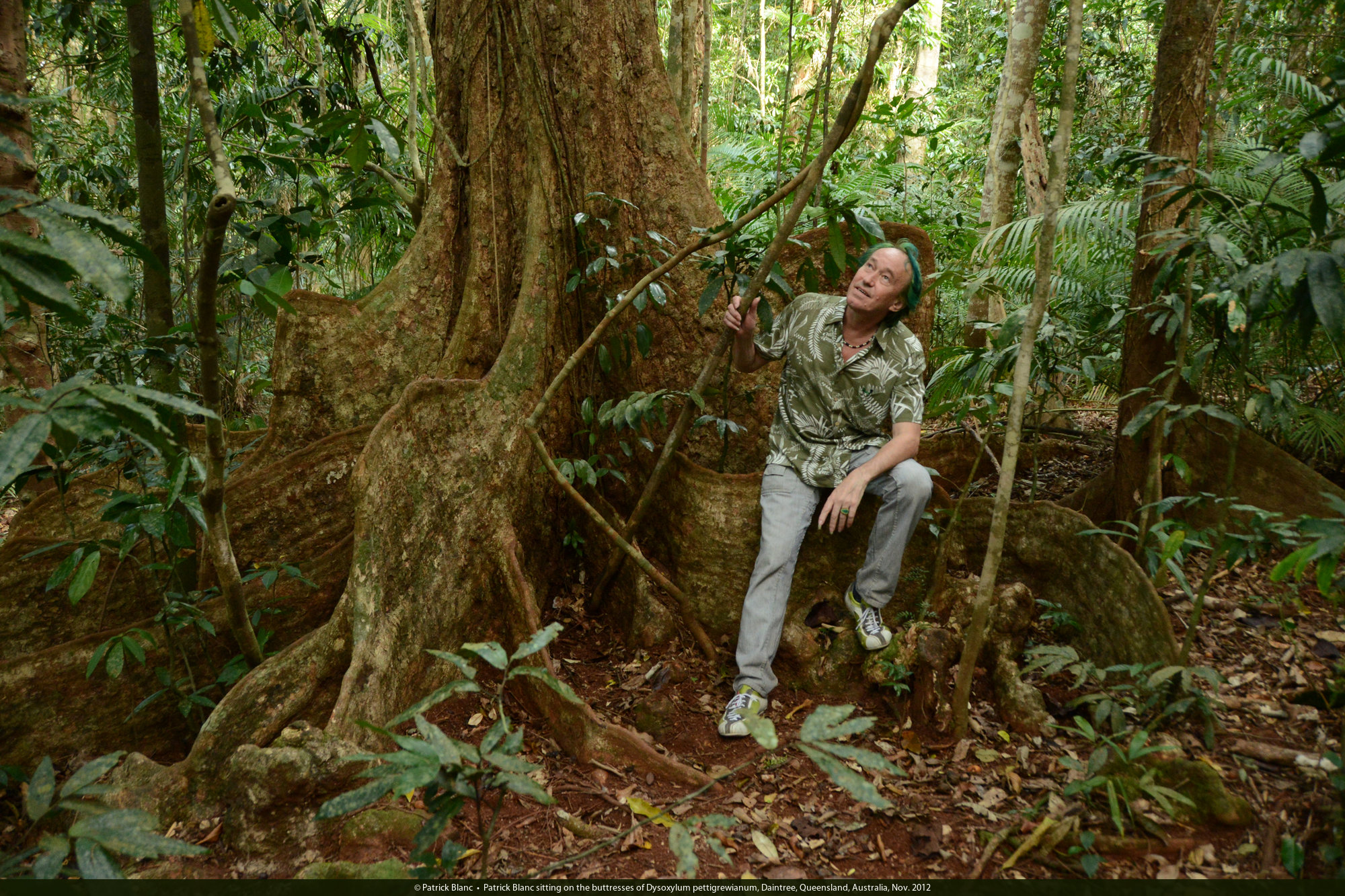 Patrick Blanc sitting on the buttresses of Dysoxylum pettigrewianum, Daintree, Queensland, Australia, Nov. 2012