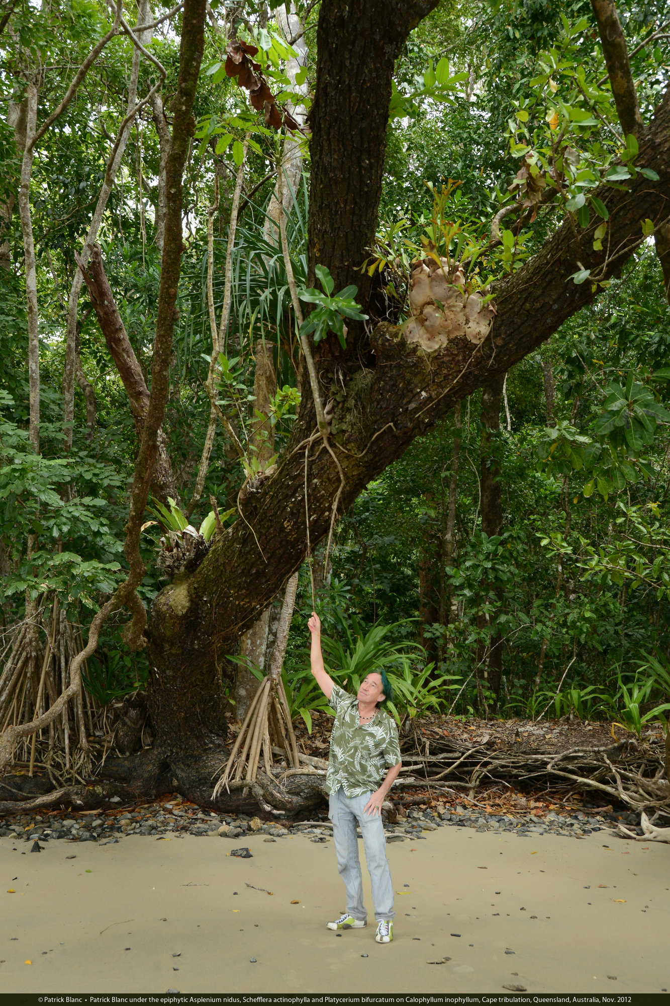 Patrick Blanc under the epiphytic Asplenium nidus, Schefflera actinophylla and Platycerium bifurcatum on Calophyllum inophyllum, Cape tribulation, Queensland, Australia, Nov. 2012