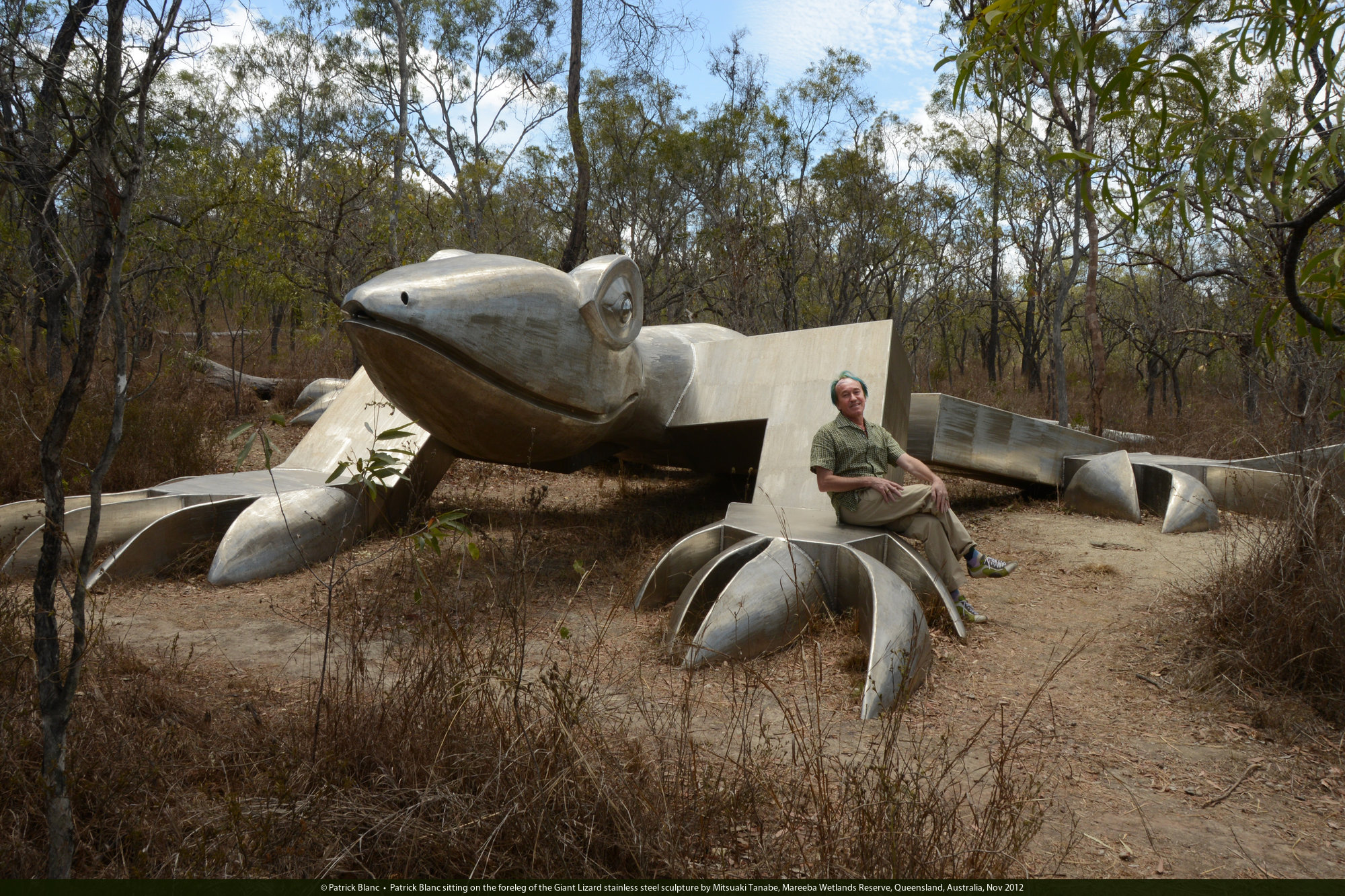 Patrick Blanc sitting on the foreleg of the Giant Lizard stainless steel sculpture by Mitsuaki Tanabe, Mareeba Wetlands Reserve, Queensland, Australia, Nov 2012