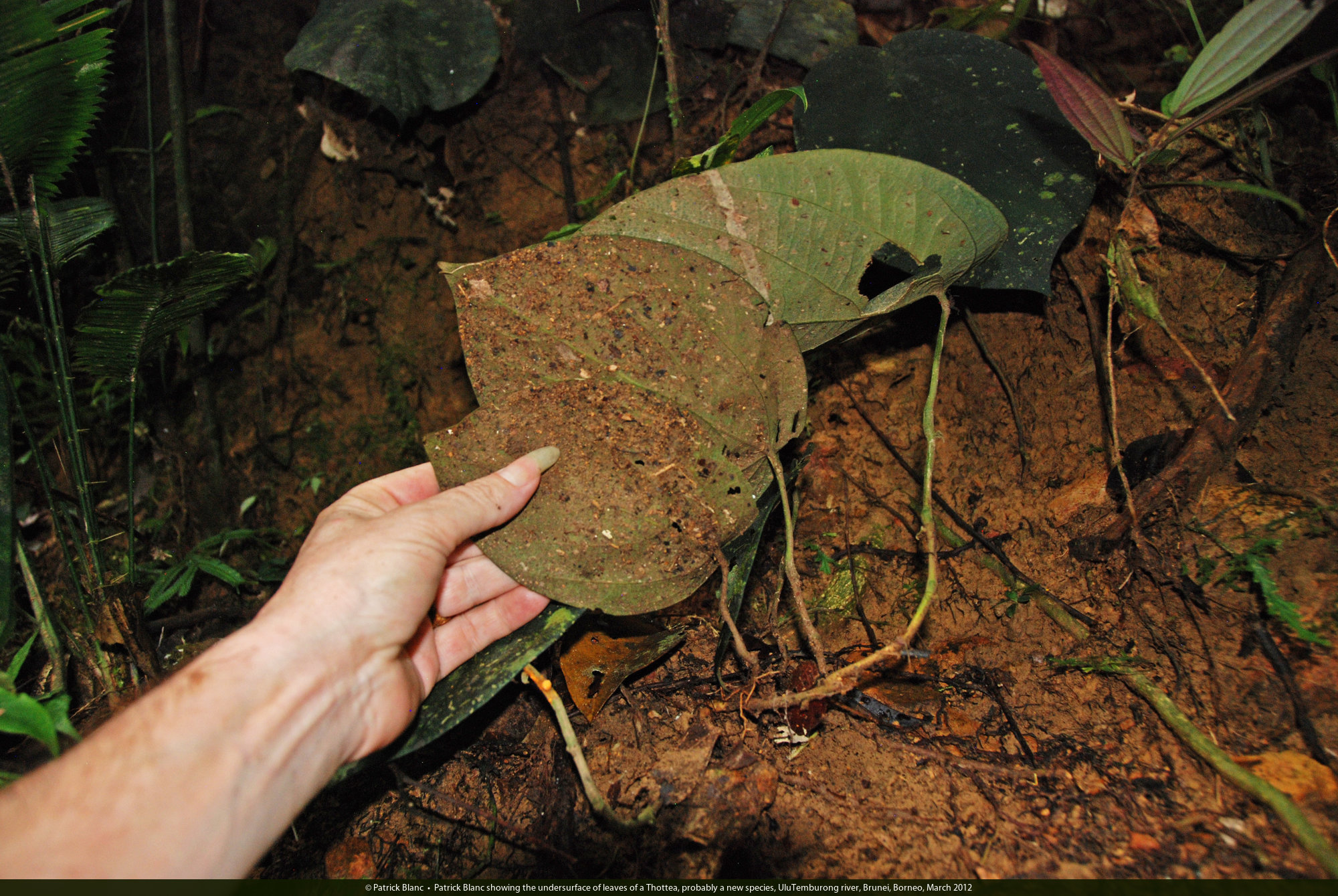 Patrick Blanc showing the undersurface of leaves of a Thottea, probably a new species, UluTemburong river, Brunei, Borneo, March 2012