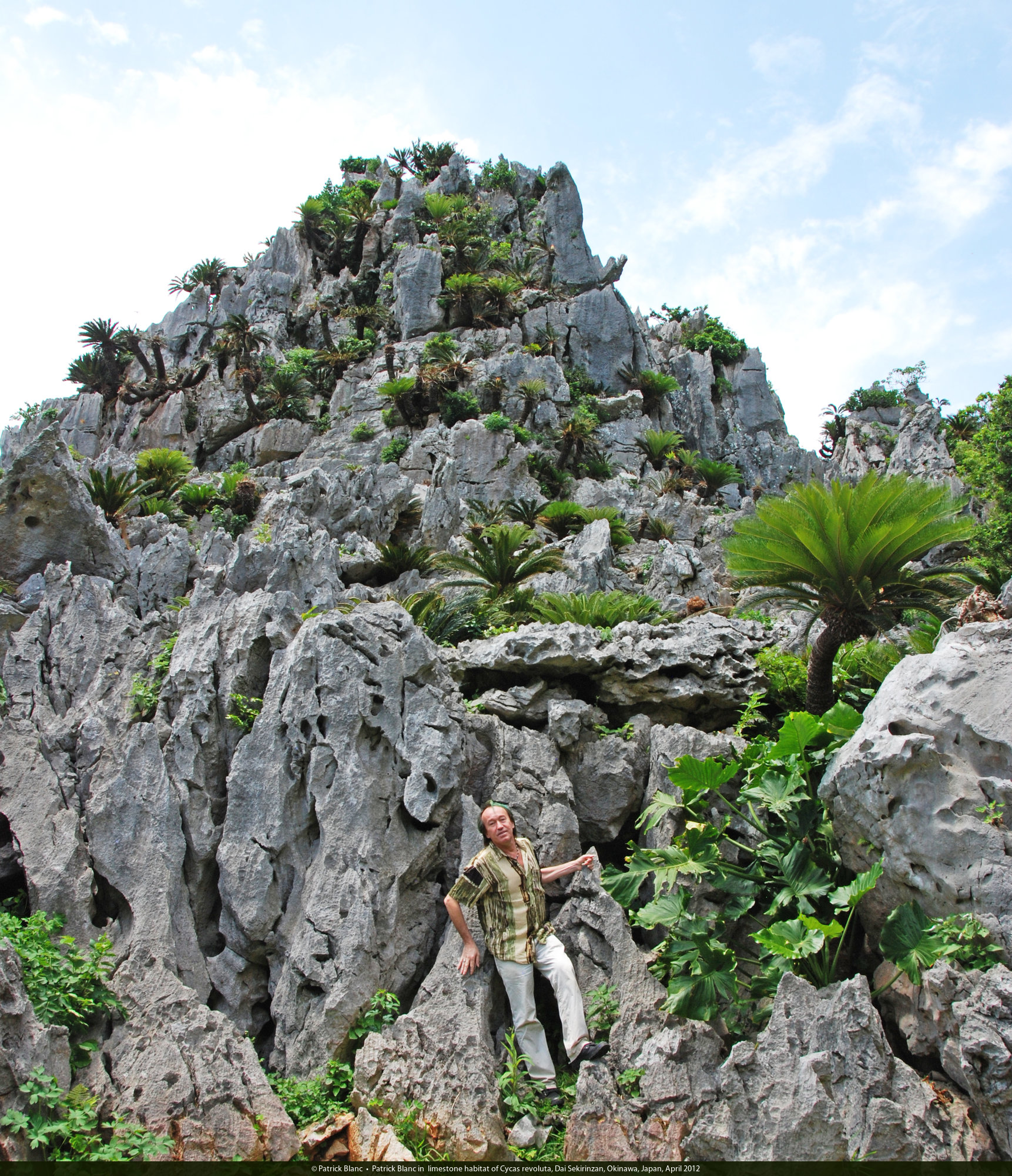 Patrick Blanc in a huge Cycas revoluta population growing on karst with Alocasia macrorrhizos and Asplenium antiquum, Dai Sekirinzan, Okinawa, Japan, April 2012