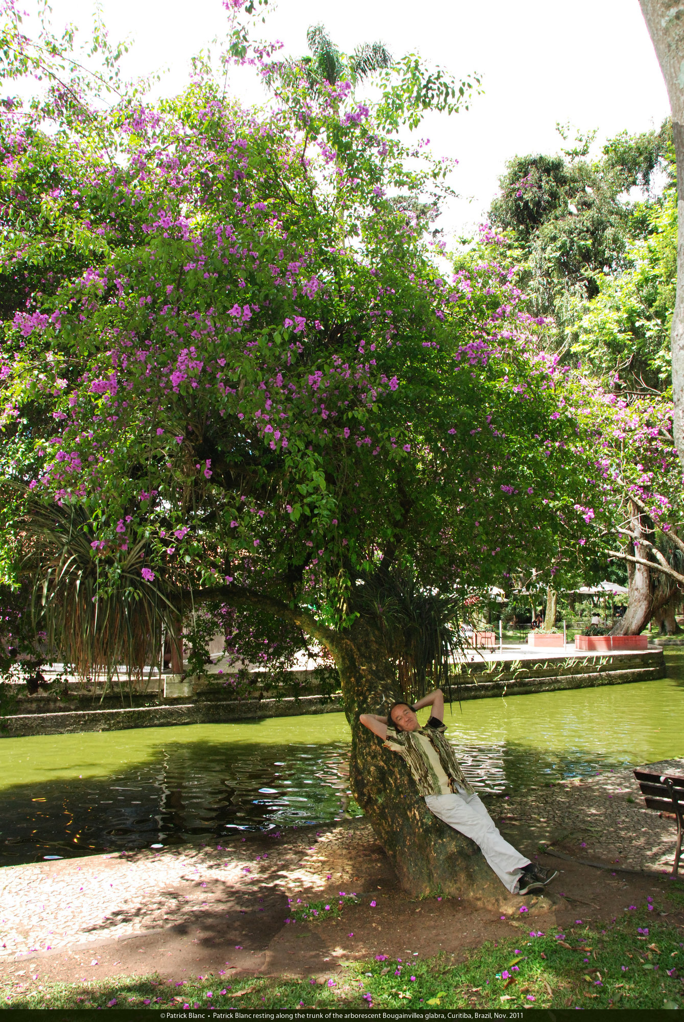Patrick Blanc resting along the trunk of the arborescent Bougainvillea glabra, Curitiba, Brazil, Nov. 2011