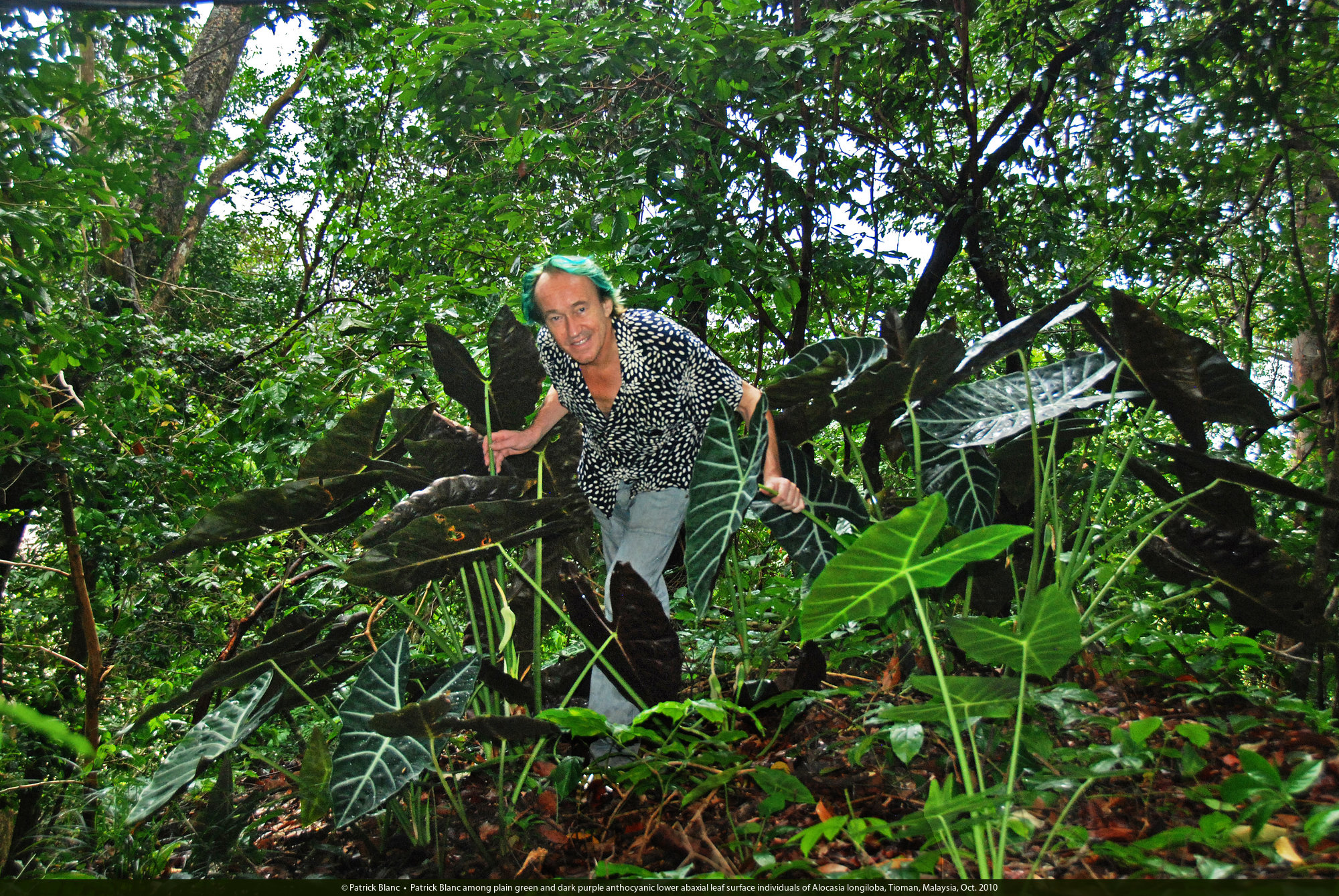 Patrick Blanc among plain green and dark purple anthocyanic lower abaxial leaf surface individuals of Alocasia longiloba, Tioman, Malaysia, Oct. 2010