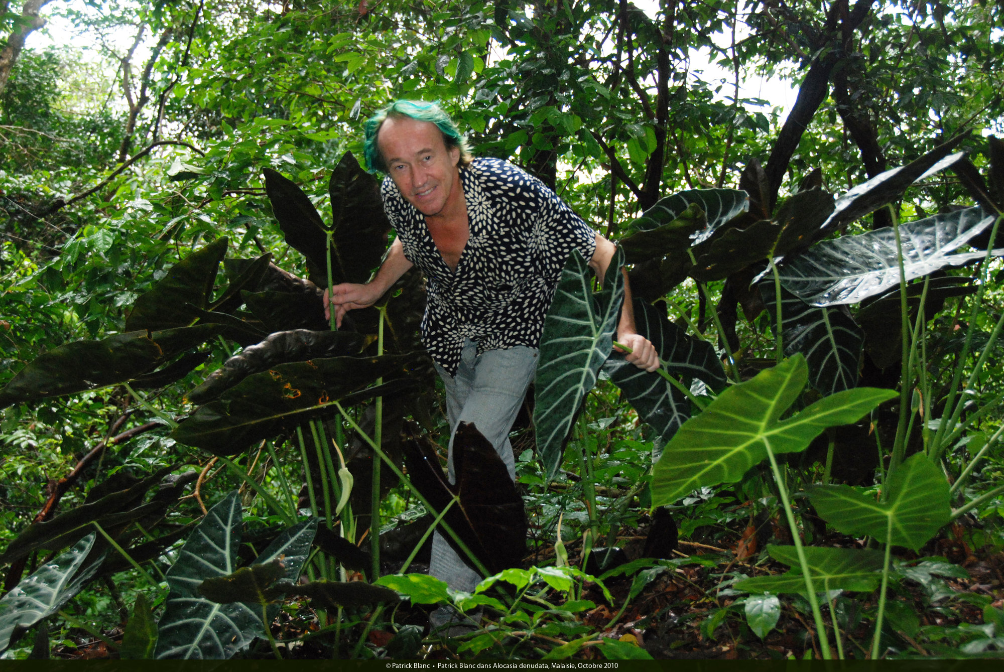 Patrick Blanc and Alocasia longiloba, plain green and purple anthocyanic forms, Tioman, Malaysia, Oct. 2010