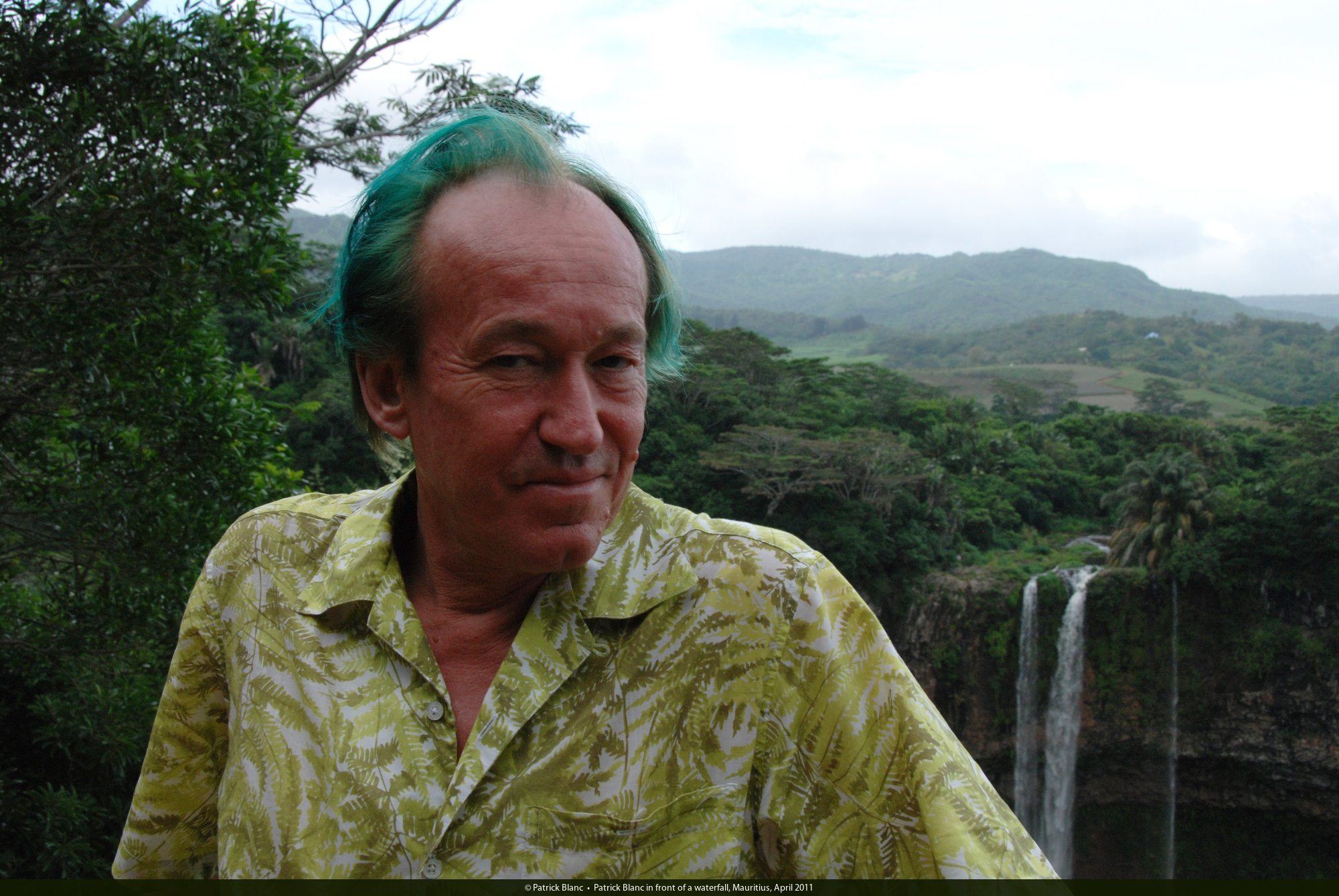 Patrick Blanc in front of a waterfall, Mauritius, April 2011
