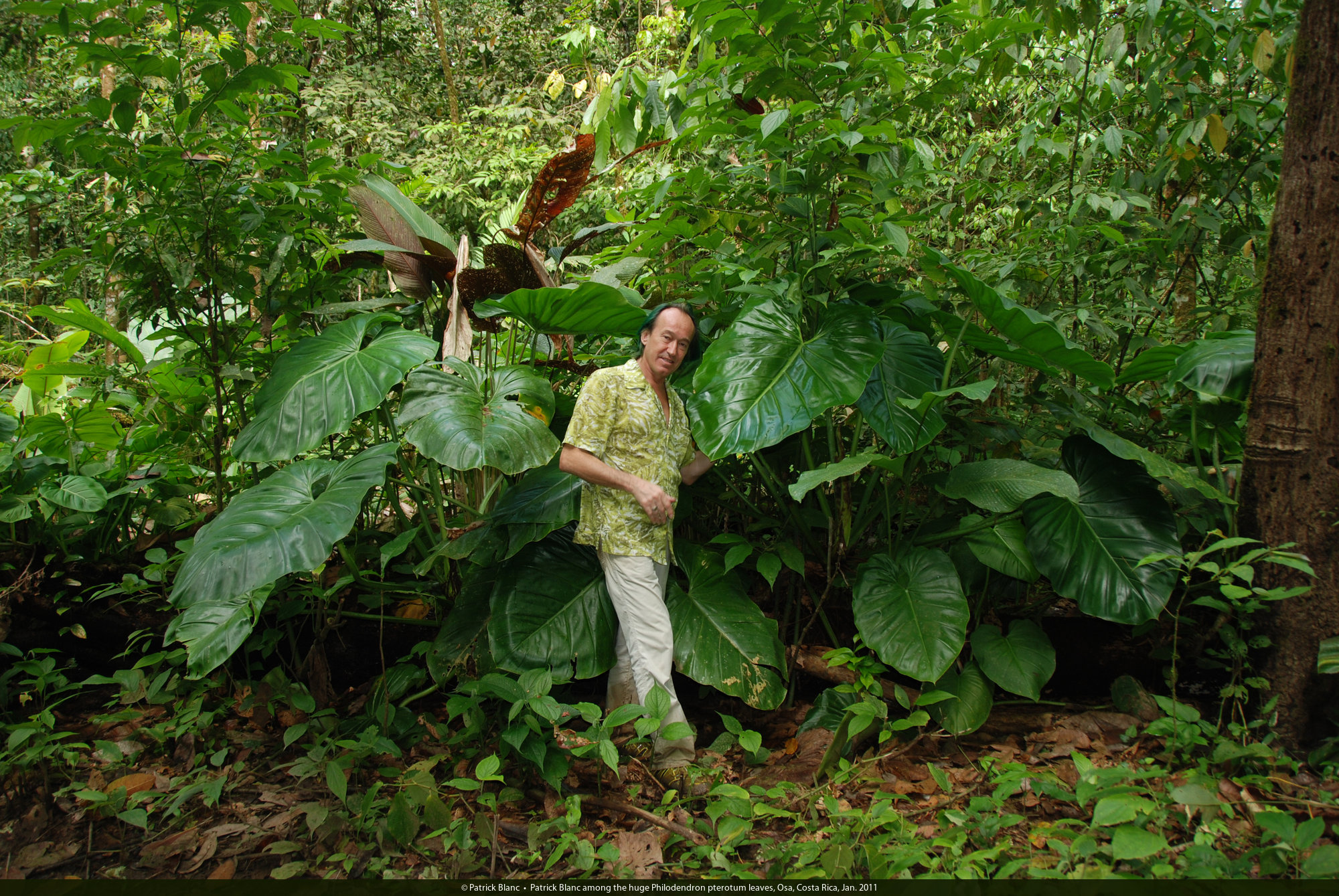 Patrick Blanc among the huge Philodendron pterotum leaves, Osa, Costa Rica, Jan. 2011