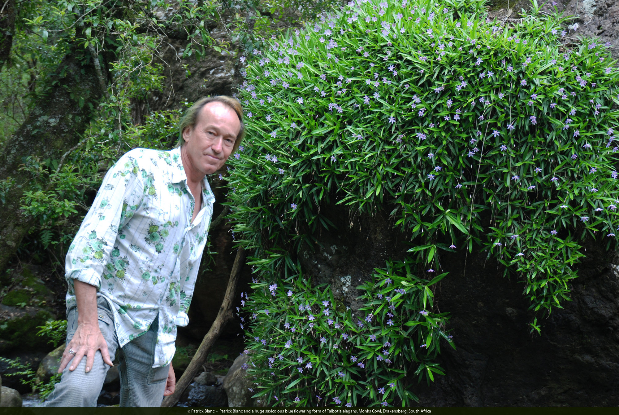 Patrick Blanc and a huge saxicolous blue flowering form of Xerophyta (syn. Talbotia) elegans, Monks Cowl, Drakensberg, South Africa, Jan. 2009