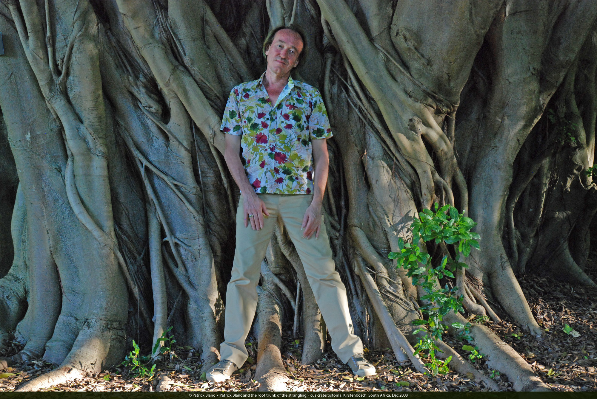 Patrick Blanc and the root trunk of the strangling Ficus craterostoma, Kirstenbosch, South Africa, Dec 2008