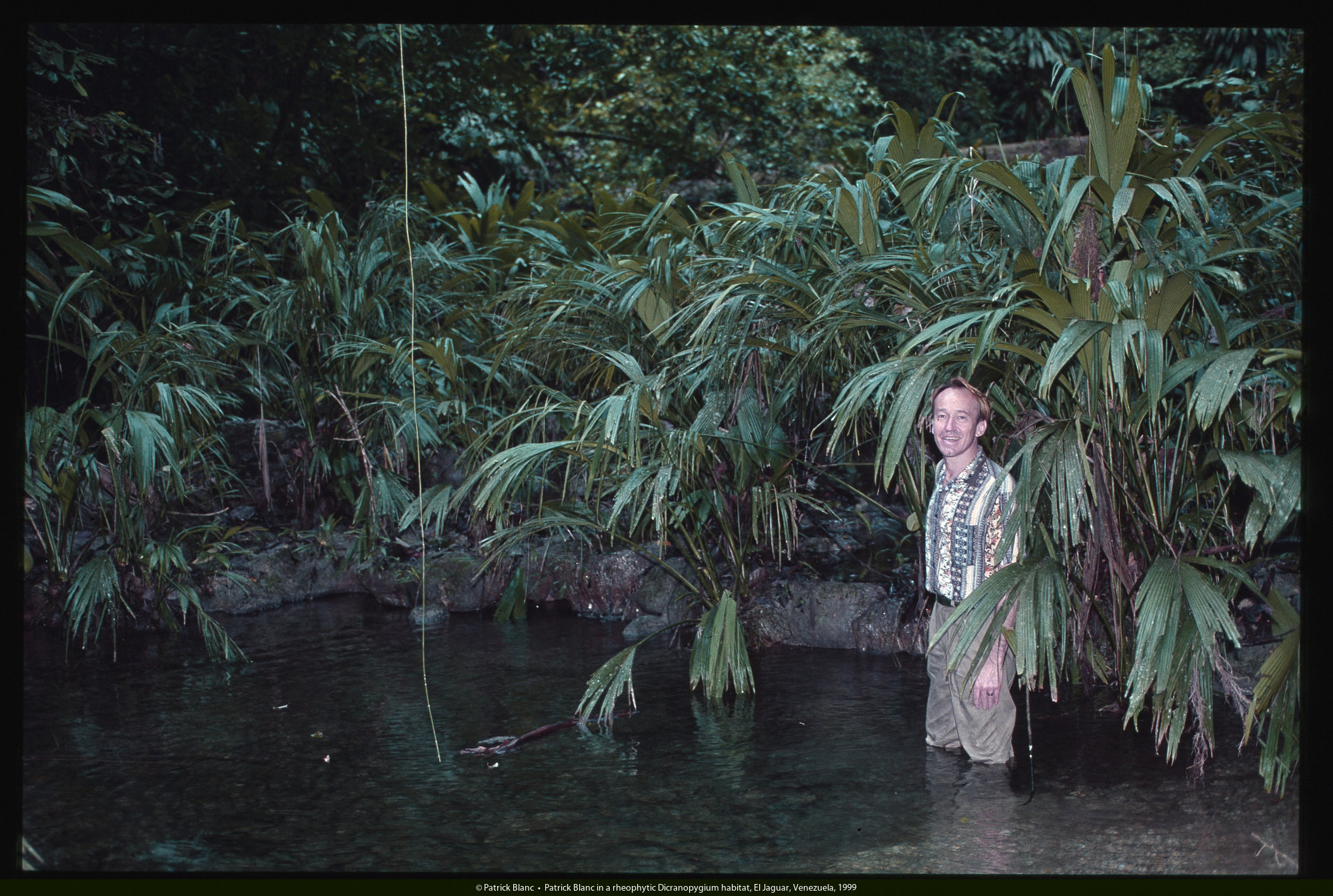 Patrick Blanc in a rheophytic Dicranopygium habitat, El Jaguar, Venezuela, March 1999