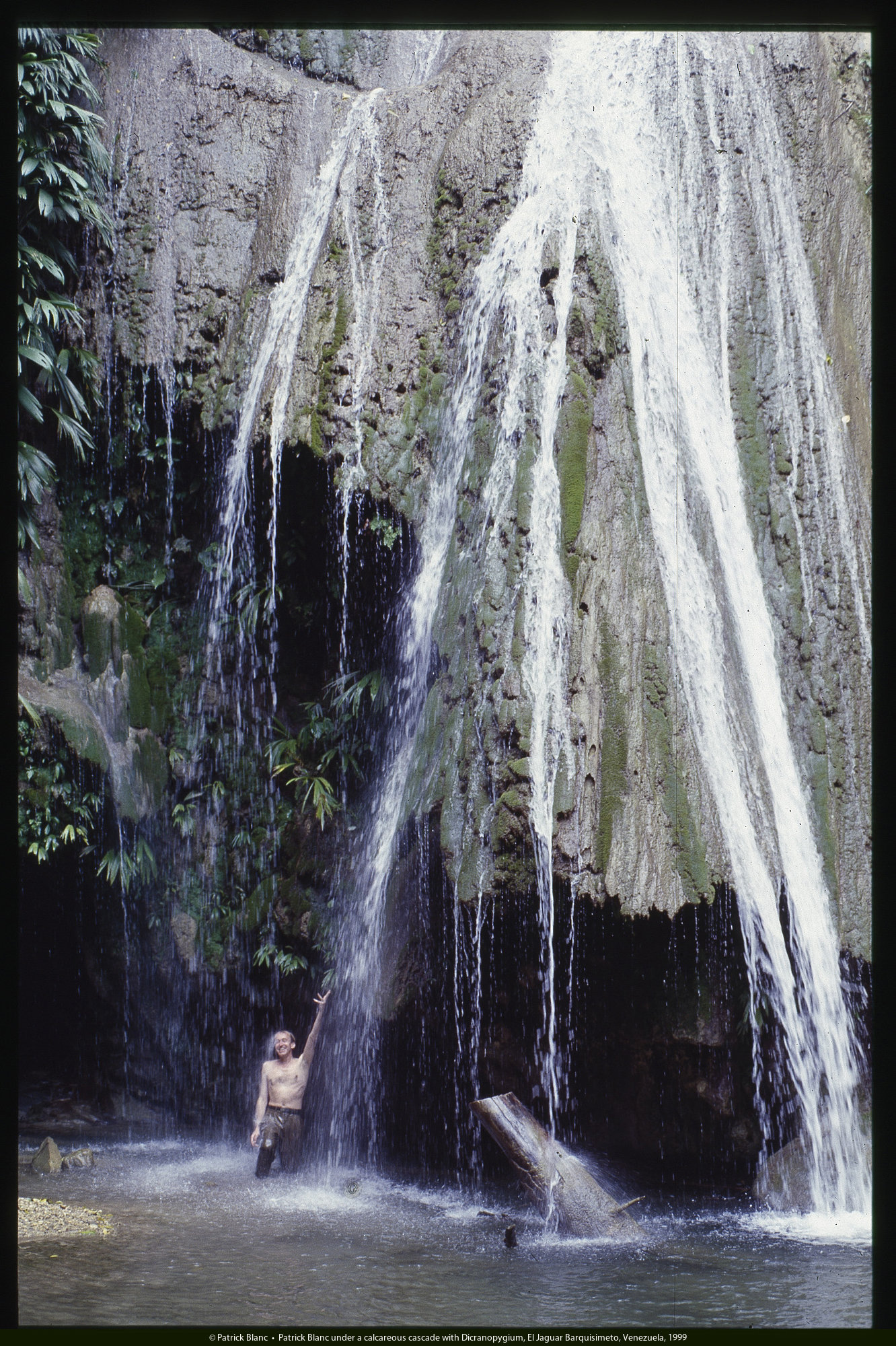 Patrick Blanc under a calcareous cascade with Dicranopygium, El Jaguar Barquisimeto, Venezuela, March 1999