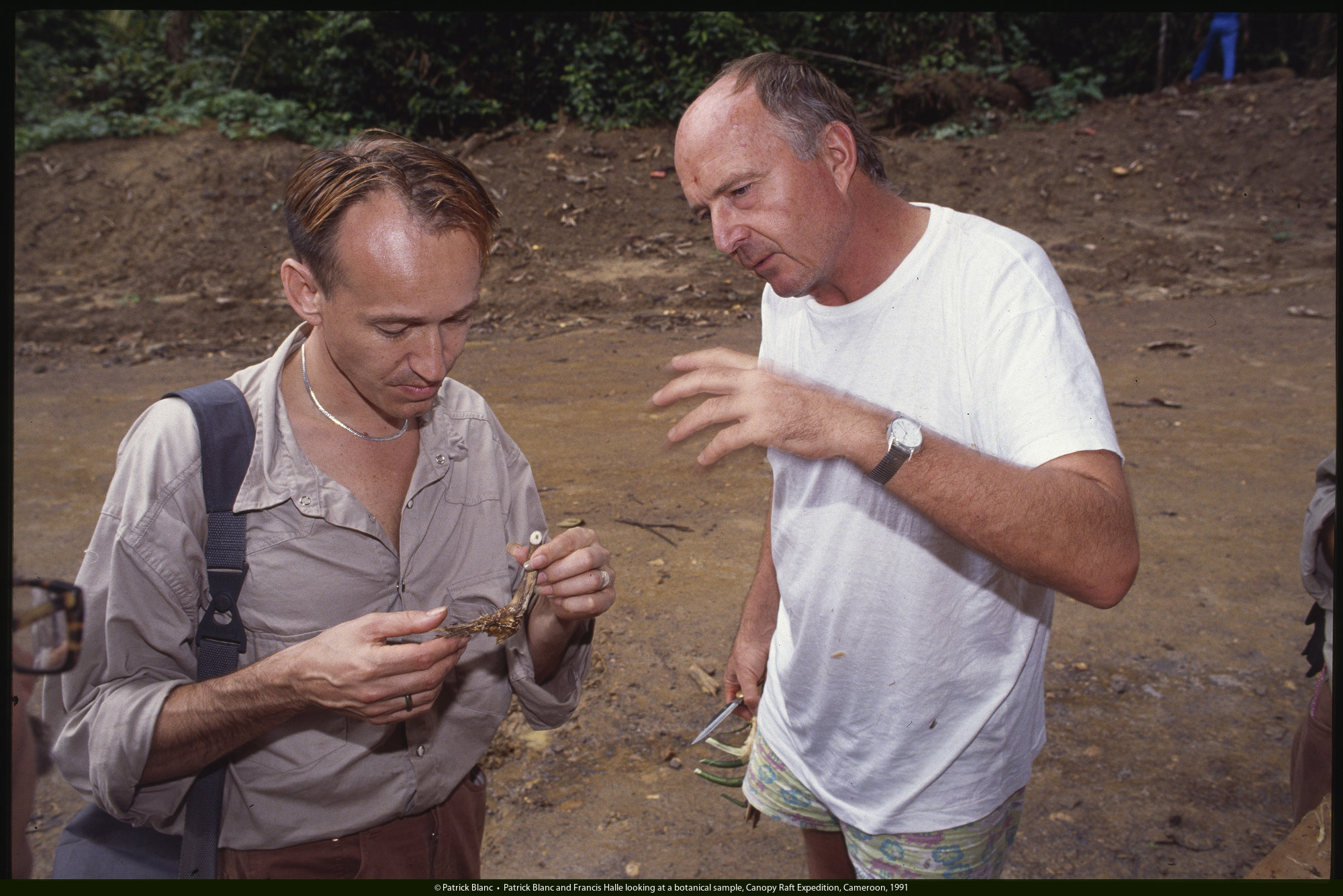 Patrick Blanc and Francis Hallé looking at a botanical sample, Radeau des Cimes, Canopy Raft Expedition, Cameroon, 1991