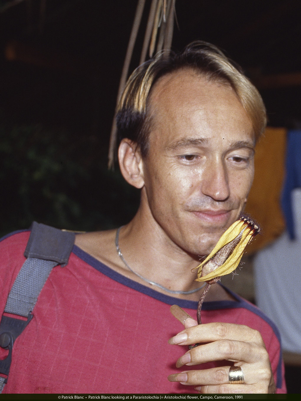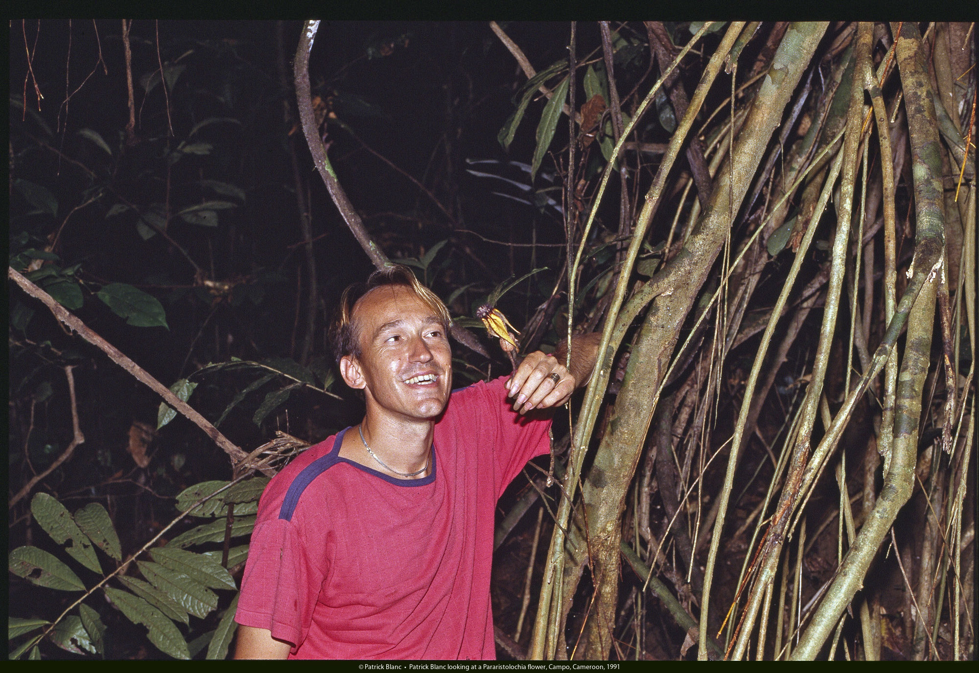 Patrick Blanc looking at a Pararistolochia (= Aristolochia) flower, Campo, Cameroon, 1991