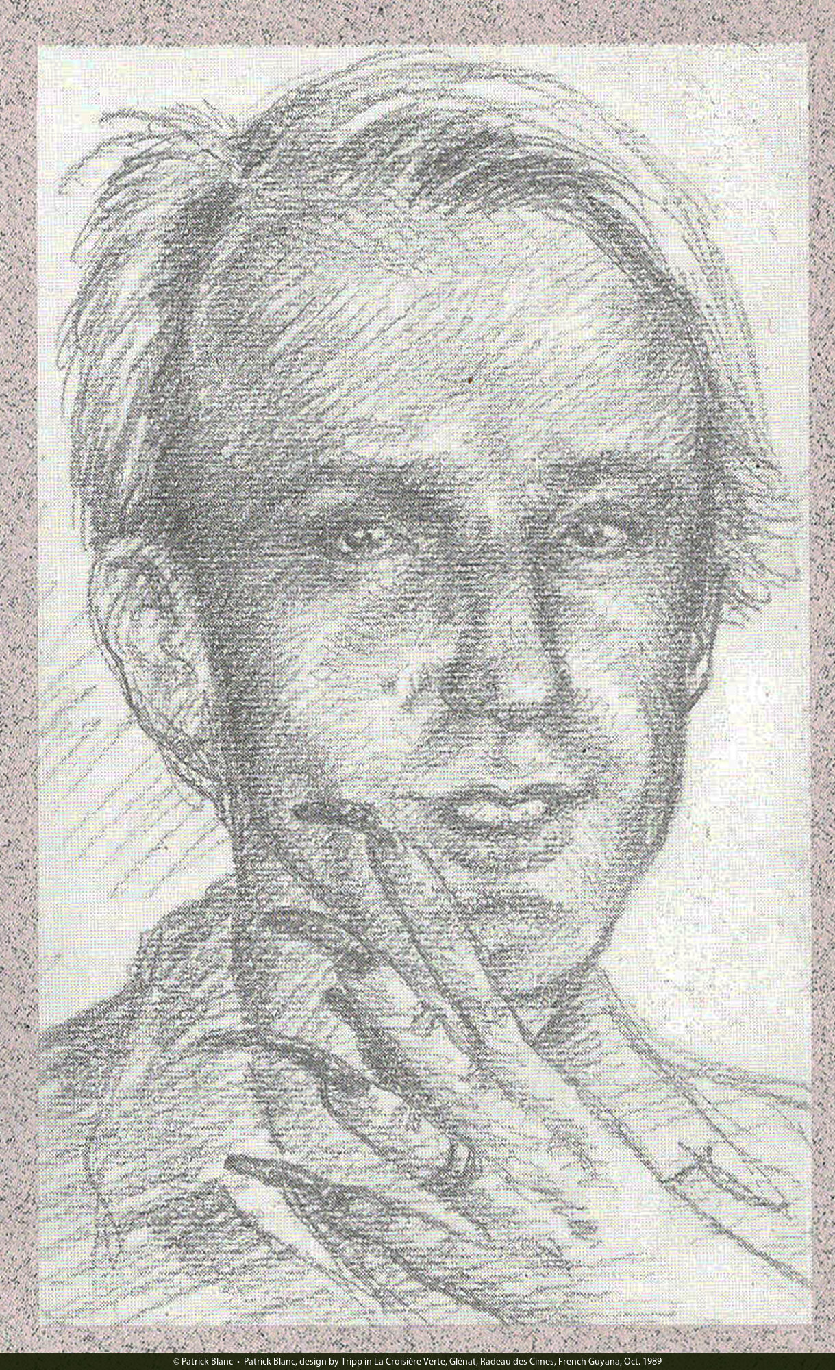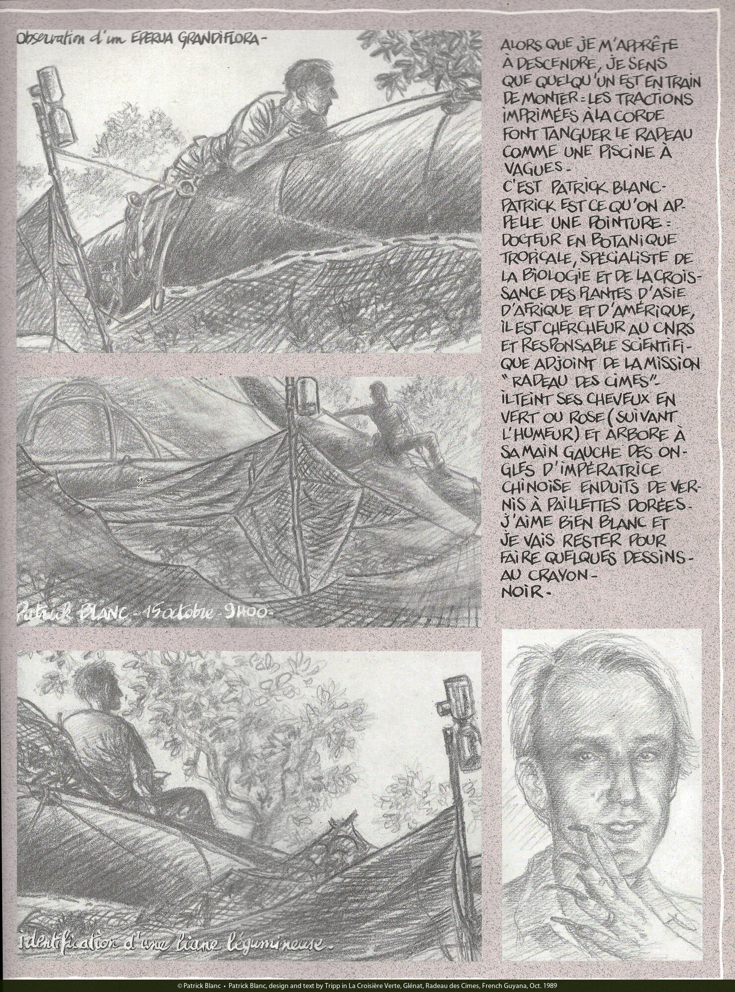 Patrick Blanc, design and text by Tripp in La Croisière Verte, Glénat, Radeau des Cimes, French Guyana, Oct. 1989