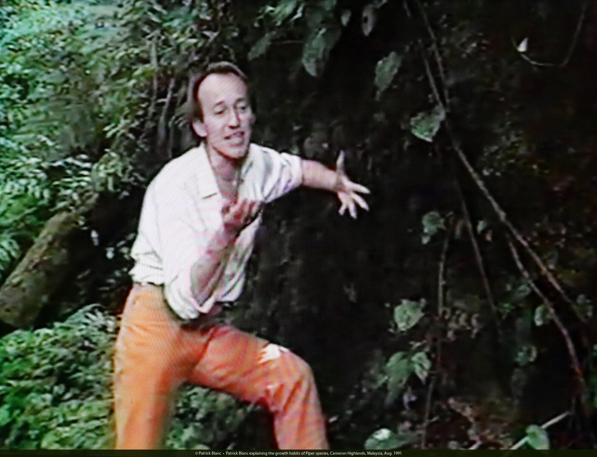Patrick Blanc explaining the growth habits of Piper species, Cameron Highlands, Malaysia, Aug. 1991