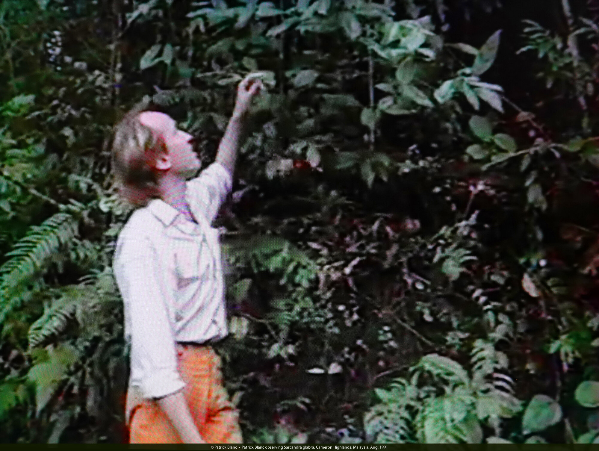 Patrick Blanc observing Sarcandra glabra, Cameron Highlands, Malaysia, Aug. 1991