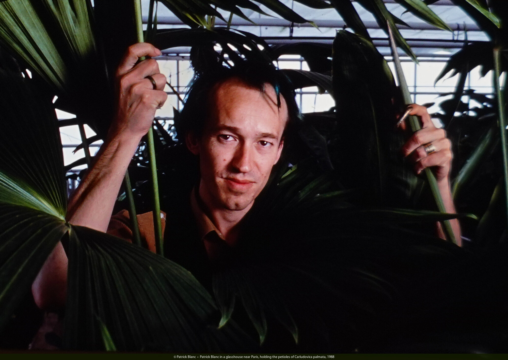 Patrick Blanc in a glasshouse near Paris, holding the petioles of Carludovica palmata, 1988