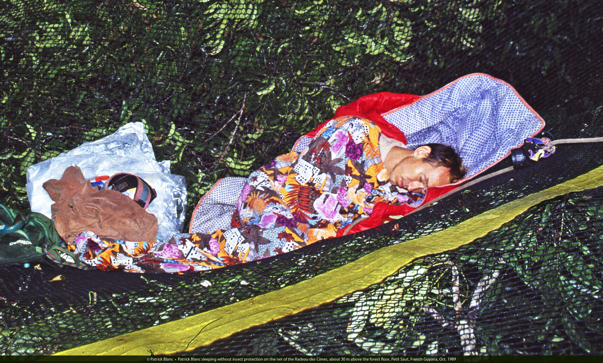 Patrick Blanc sleeping without insect protection on the net of the Radeau des Cimes, about 30 m above the forest floor, Petit Saut, French Guyana, Oct. 1989