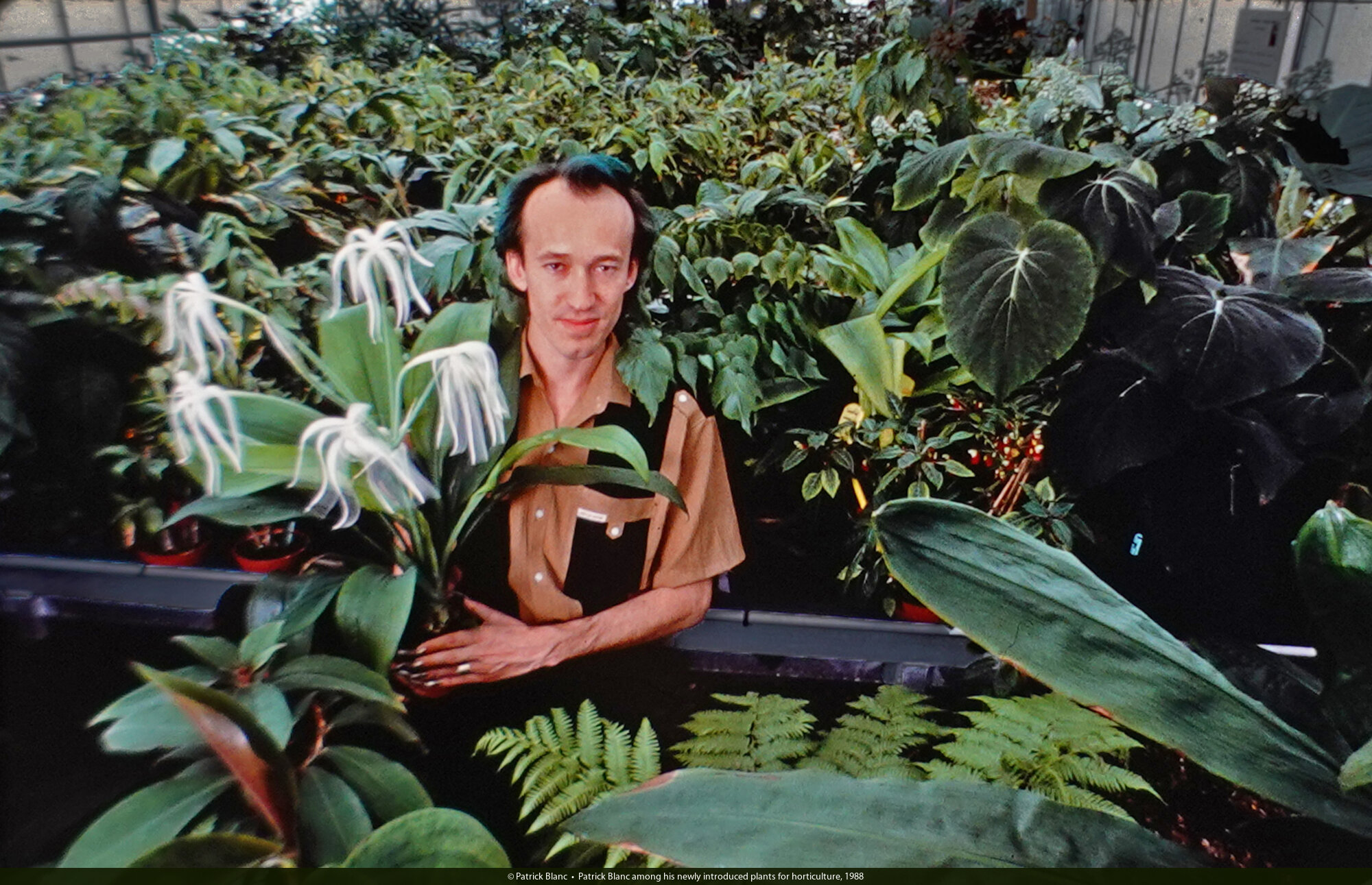 Patrick Blanc among his newly introduced plants for horticulture, 1988