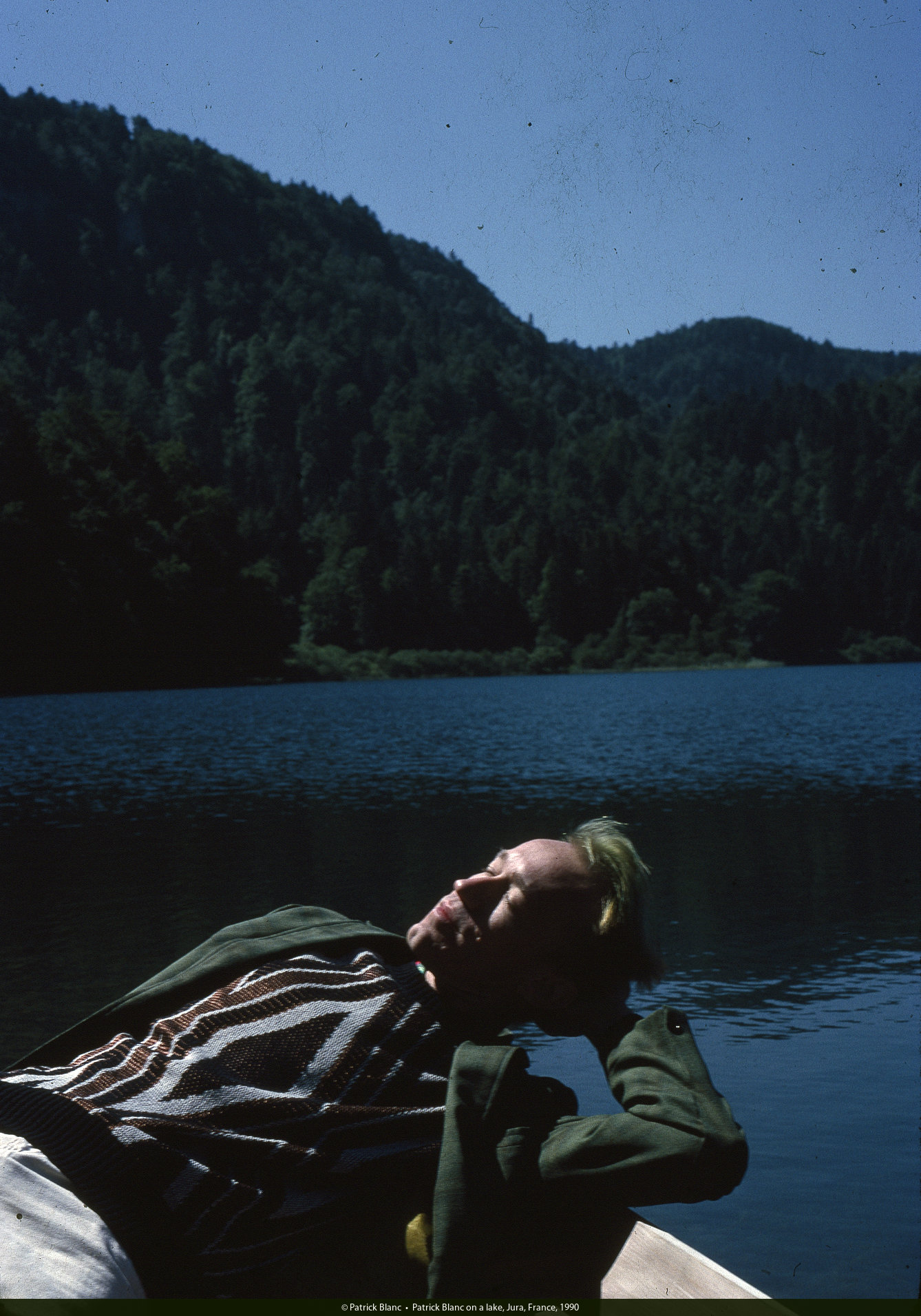 Patrick Blanc on a lake, Jura, France, 1990