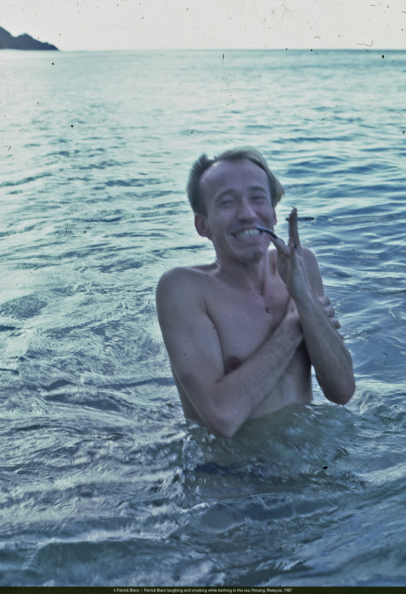 Patrick Blanc laughing and smoking while bathing in the sea, Penang, Malaysia, 1987