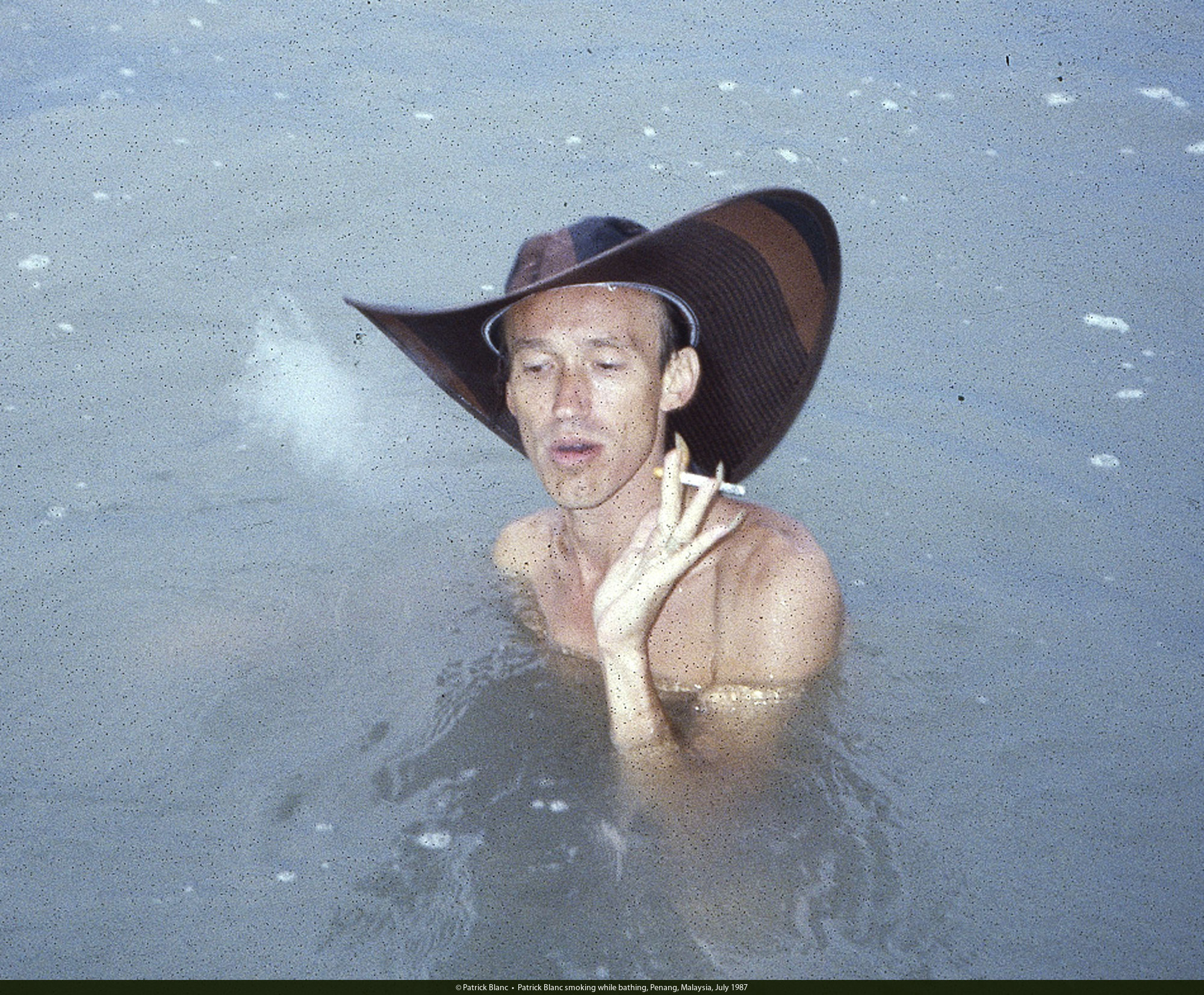 Patrick Blanc smoking while bathing, Penang, Malaysia, July 1987
