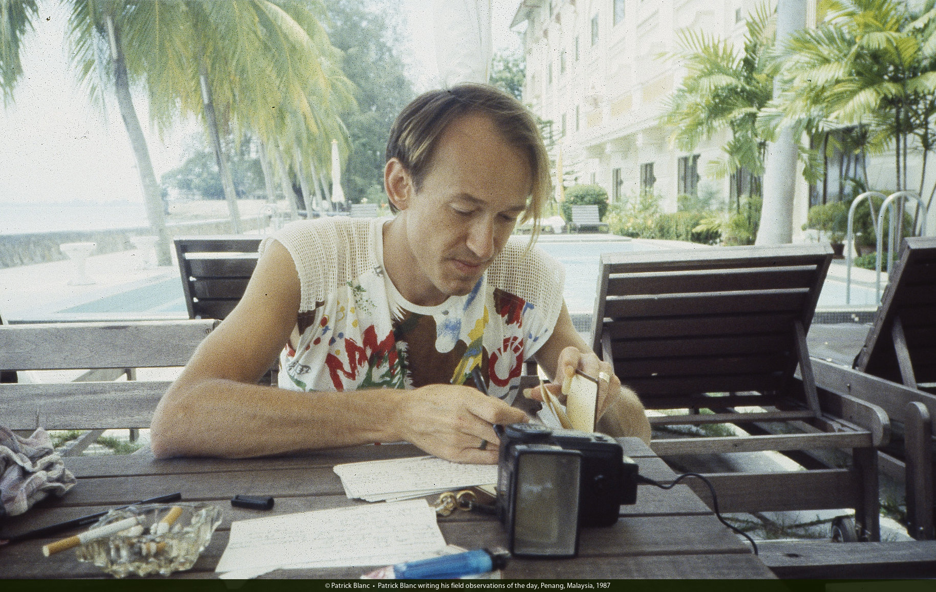 Patrick Blanc writing his field observations of the day, Penang, Malaysia, Aug. 1987