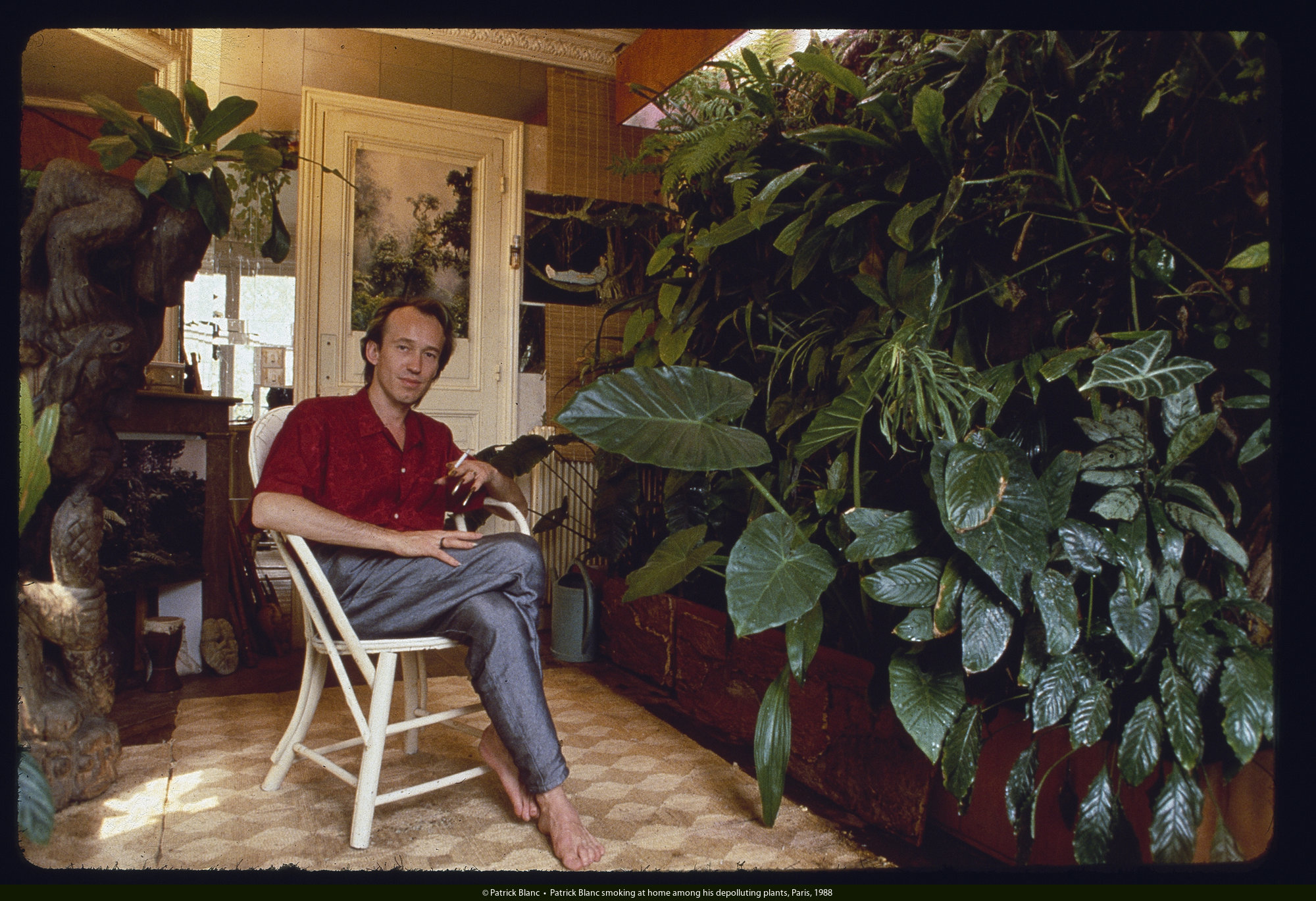 Patrick Blanc smoking at home among his depolluting plants, Paris, 1988