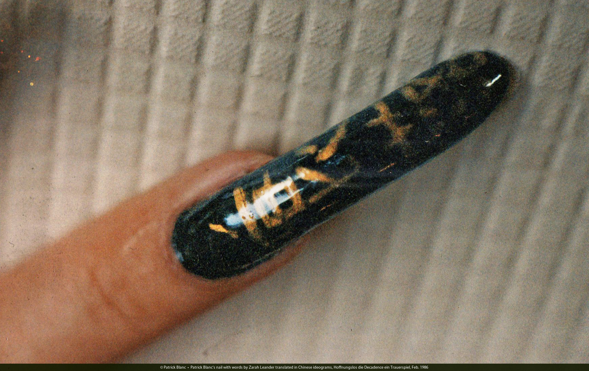 Patrick Blanc's nail with words by Zarah Leander translated in Chinese ideograms, Hoffnungslos die Decadence ein Trauerspiel, Feb. 1986
