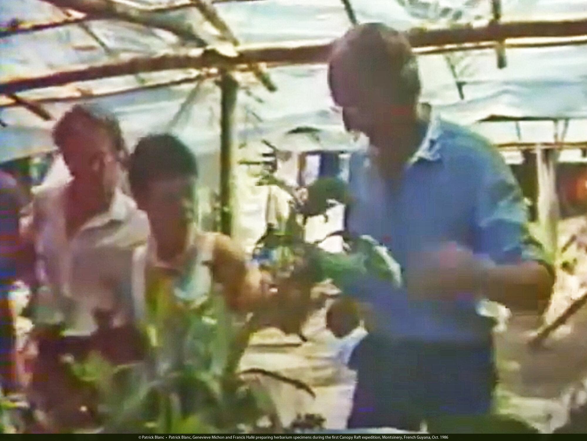 Patrick Blanc, Genevieve Michon and Francis Hallé preparing herbarium specimens during the first Canopy Raft expedition, Montsinery, French Guyana, Oct. 1986