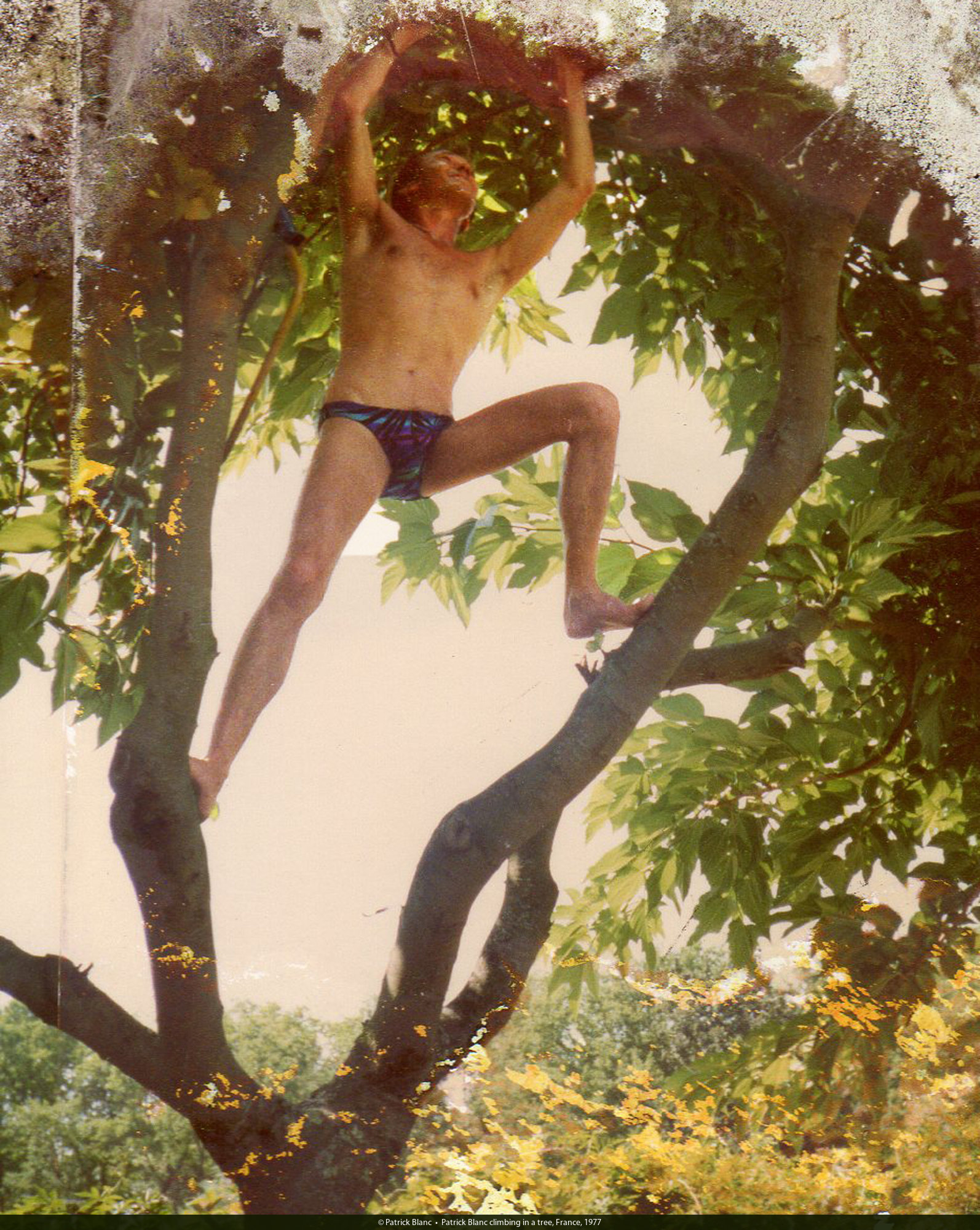 Patrick Blanc climbing in a tree, France, 1977