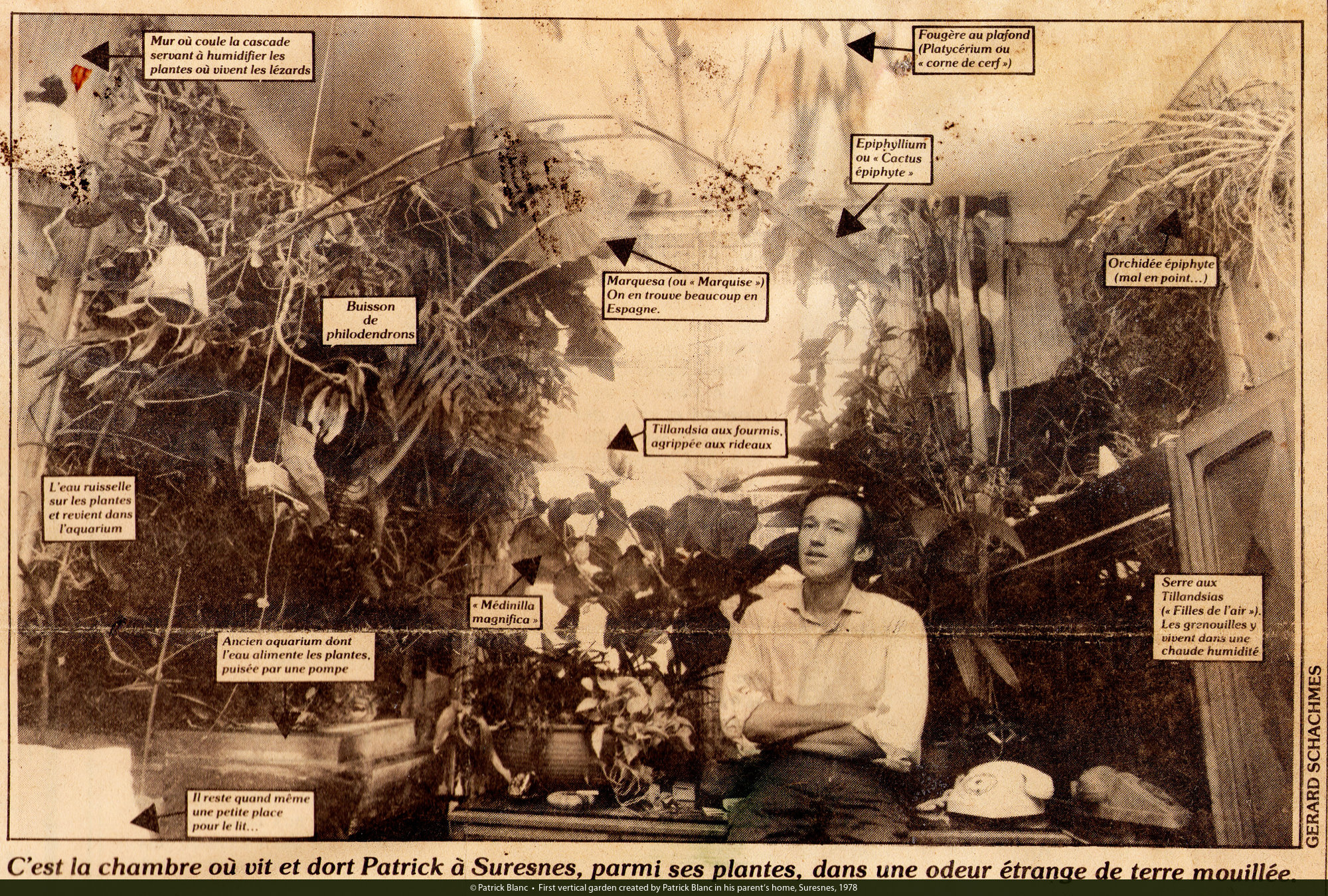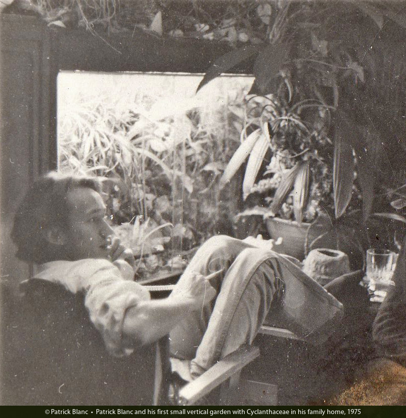 Patrick Blanc and his first small vertical garden with Cyclanthaceae in his family home, 1975