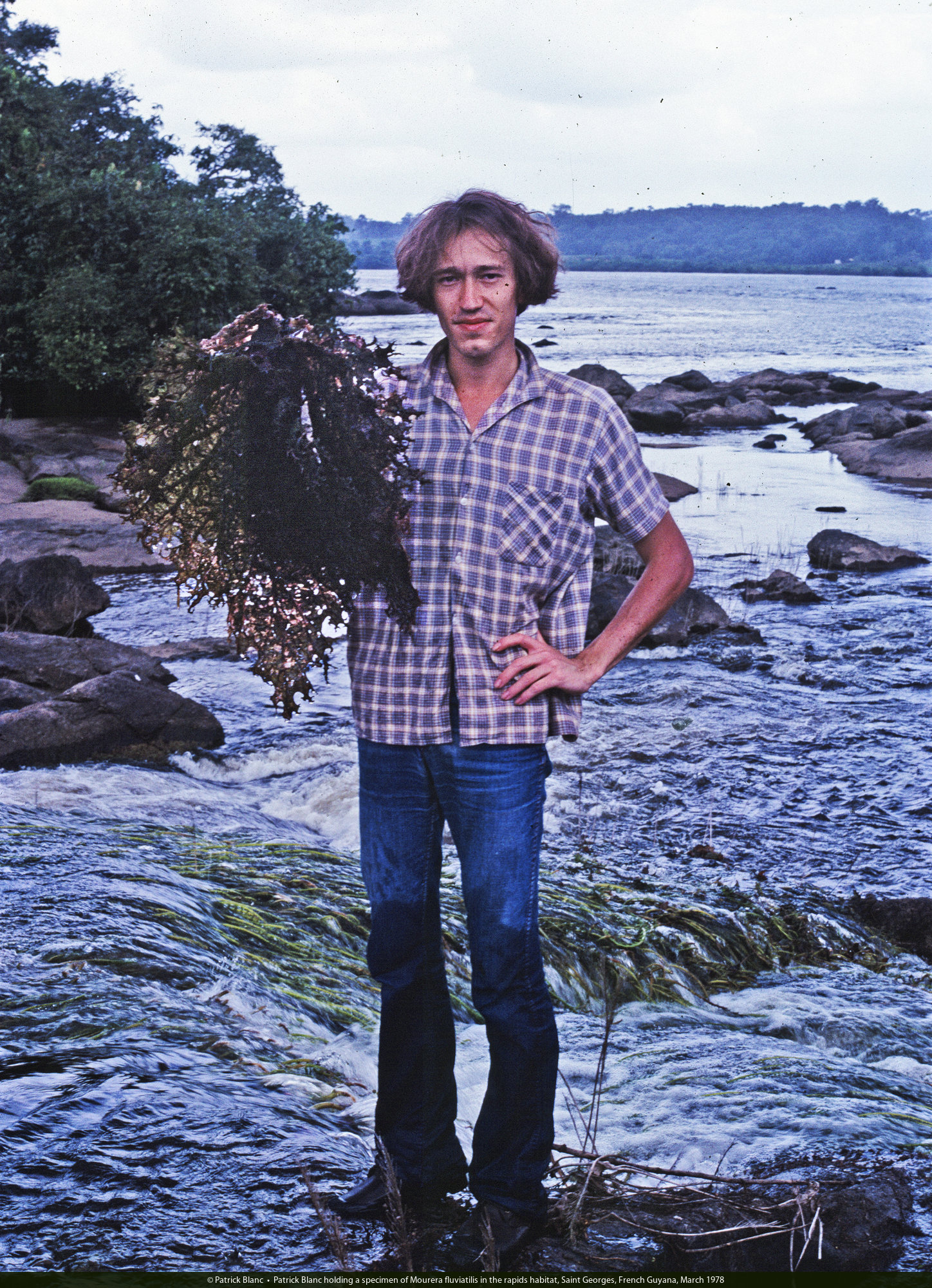 Patrick Blanc holding a specimen of Mourera fluviatilis in the rapids habitat, Saint Georges, French Guyana, March 1978
