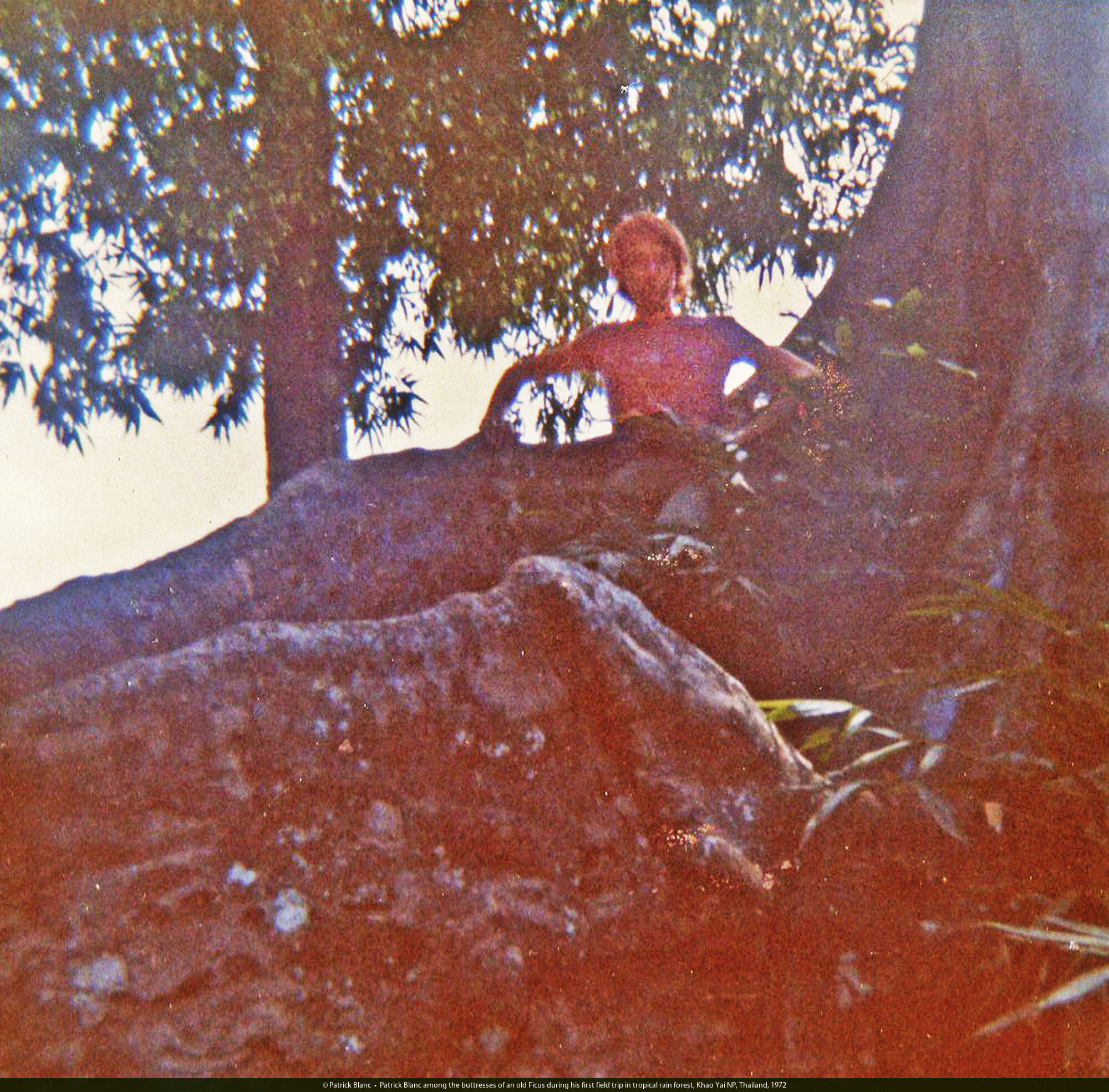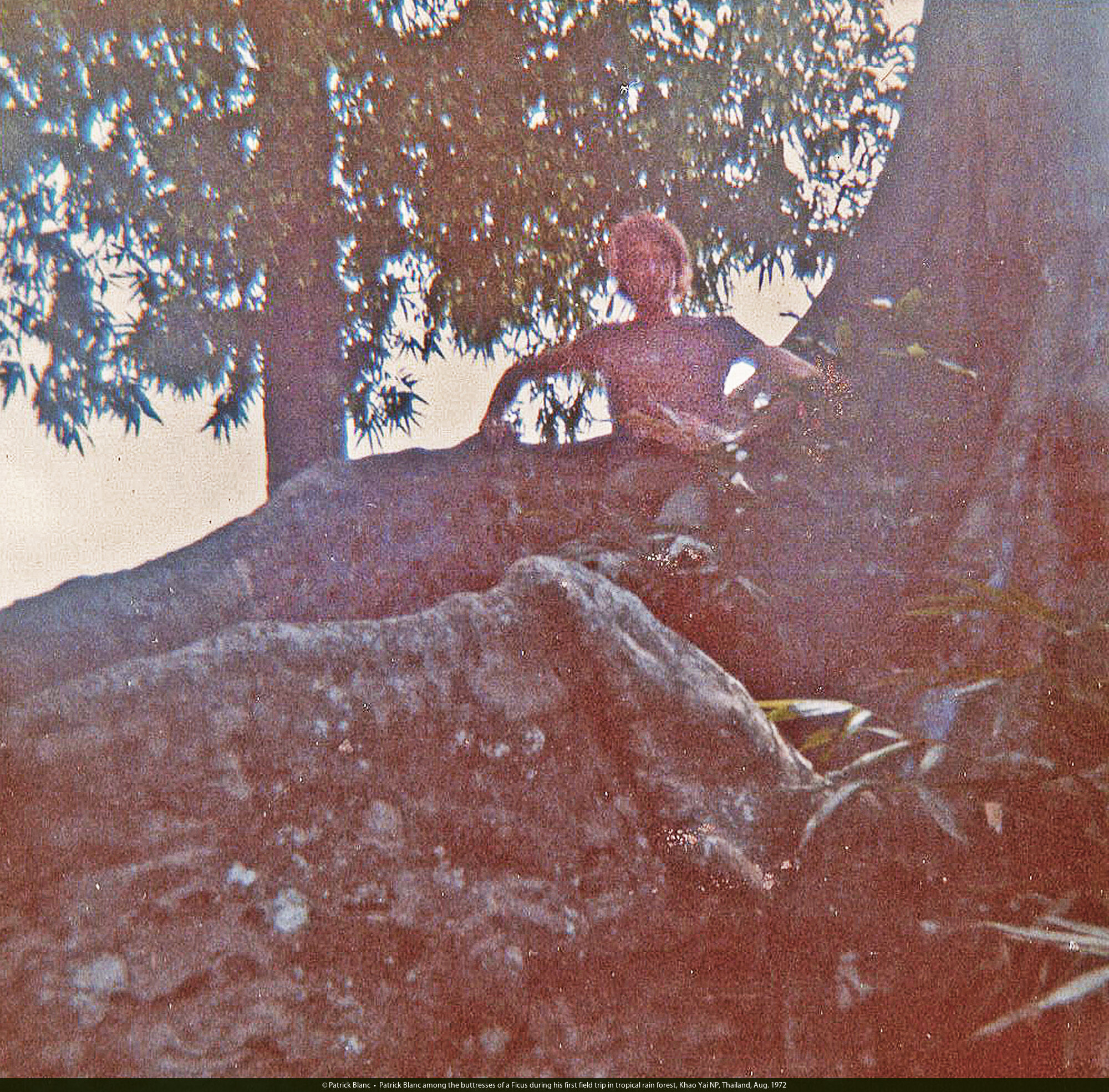 Patrick Blanc among the buttresses of a Ficus during his first field trip in tropical rain forest, Khao Yai NP, Thailand, Aug. 1972