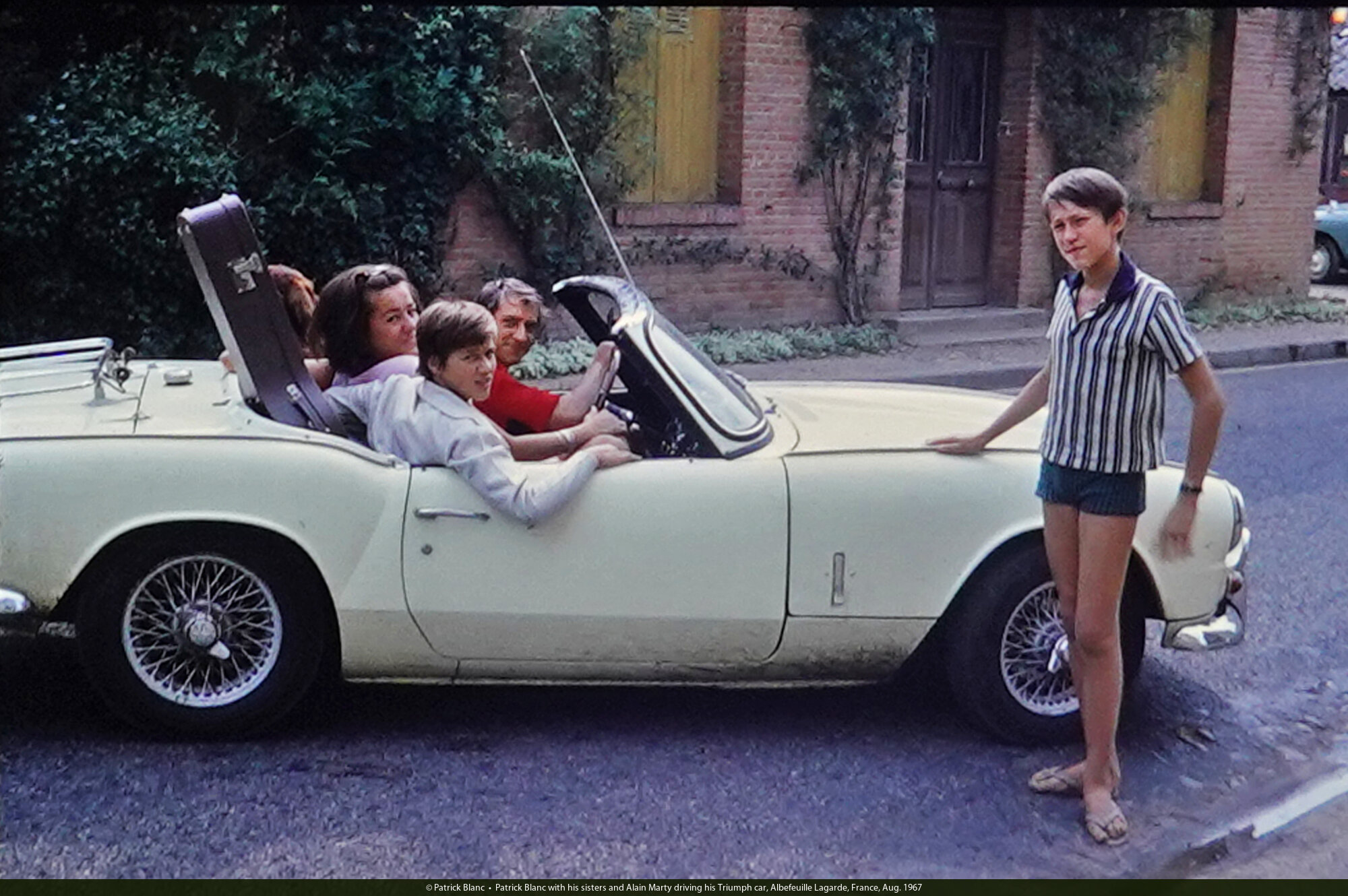 Patrick Blanc with his sisters and Alain Marty driving his Triumph car, Albefeuille Lagarde, France, Aug. 1967
