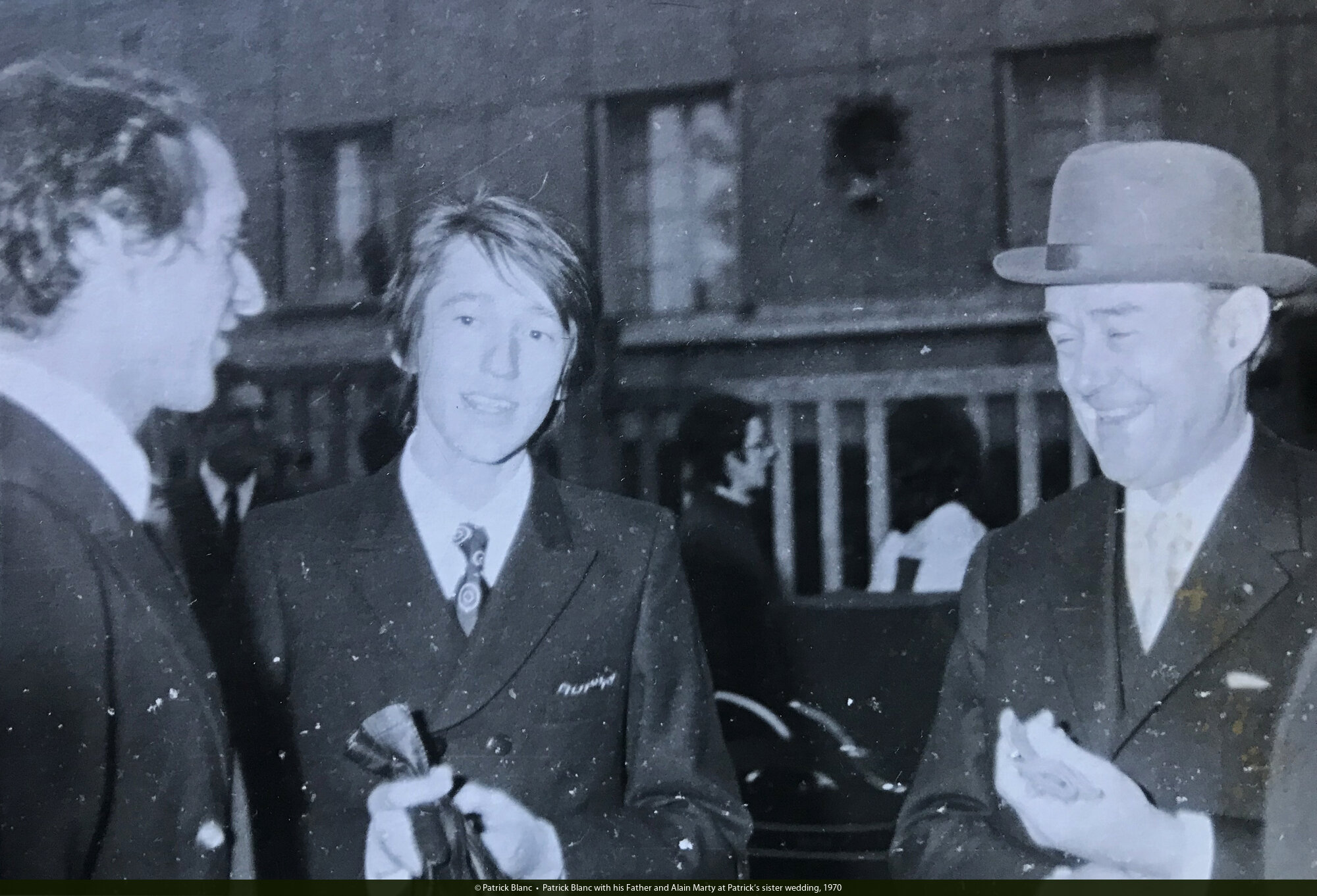 Patrick Blanc with his Father and Alain Marty at Patrick's sister wedding, 1970